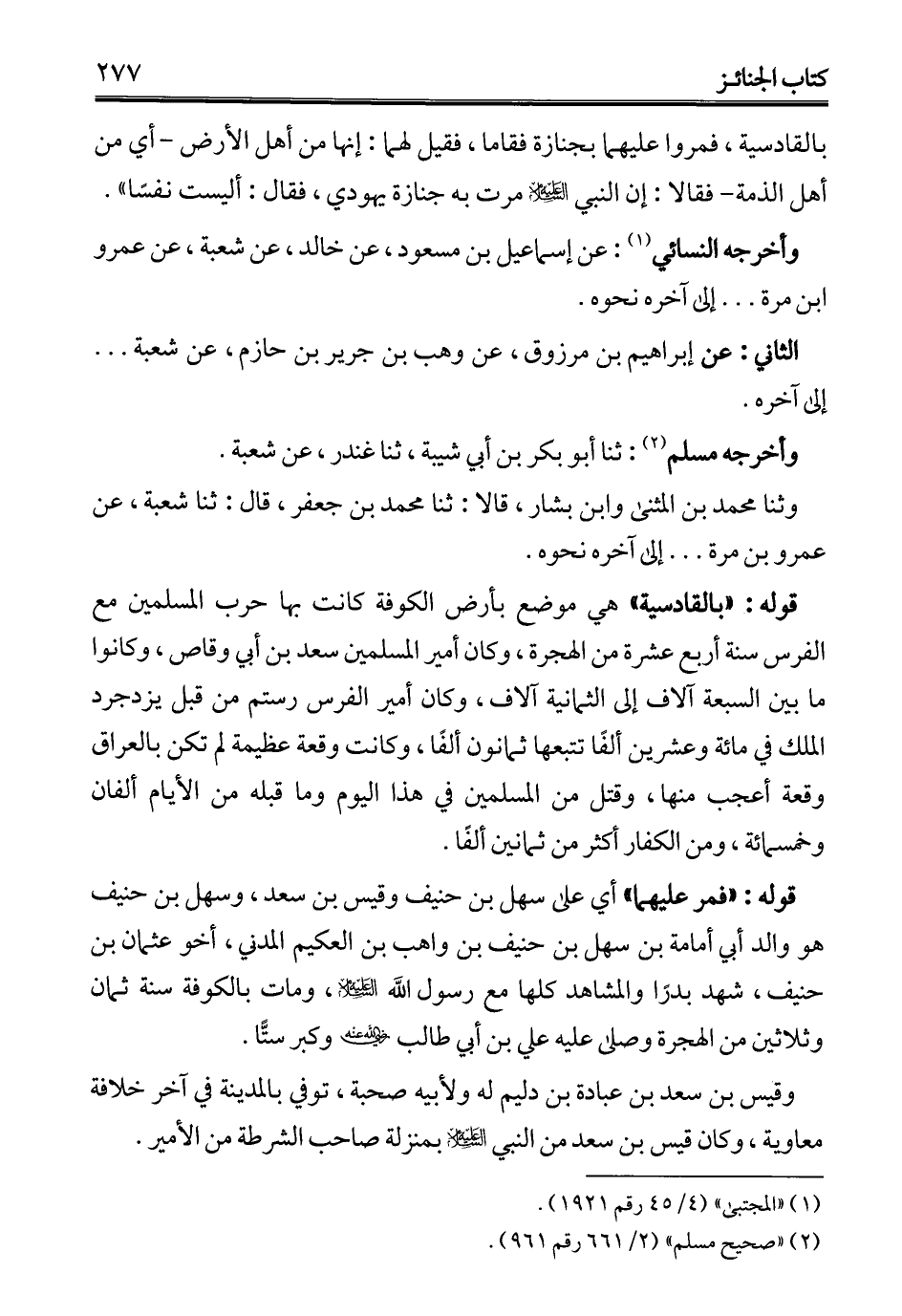 بالقادسية، فمروا عليهما بجنازة فقاما، فقيل لهما: إنها من أهل الأرض -أي من أهل الذمة- فقالا: إن النبي - عليه السلام - مرت به جنازة يهودي، فقال: أليست نفسًا".