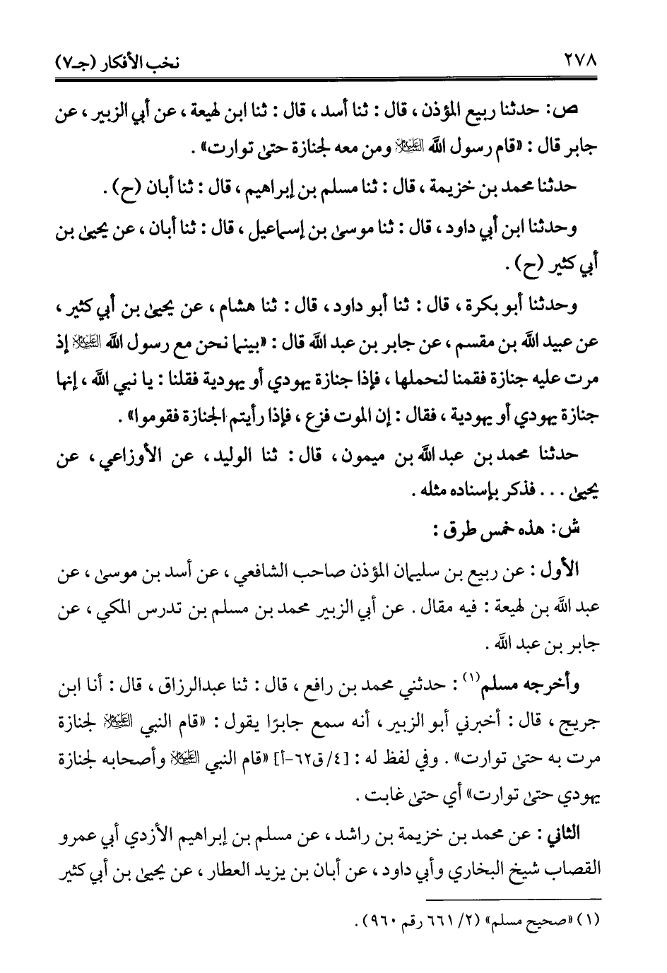 وأخرجه مسلم (¬1): حدثني محمد بن رافع، قال: ثنا عبد الرزاق، قال: أنا ابن جريج، قال: أخبرني أبو الزبير، أنه سمع جابزا يقول: "قام النبي - عليه السلام - لجنازة مرت به حتى توارت". وفي لفظ له: "قام النبي - عليه السلام - وأصحابه لجنازة يهودي حتى توارت" أي حتى غابت.