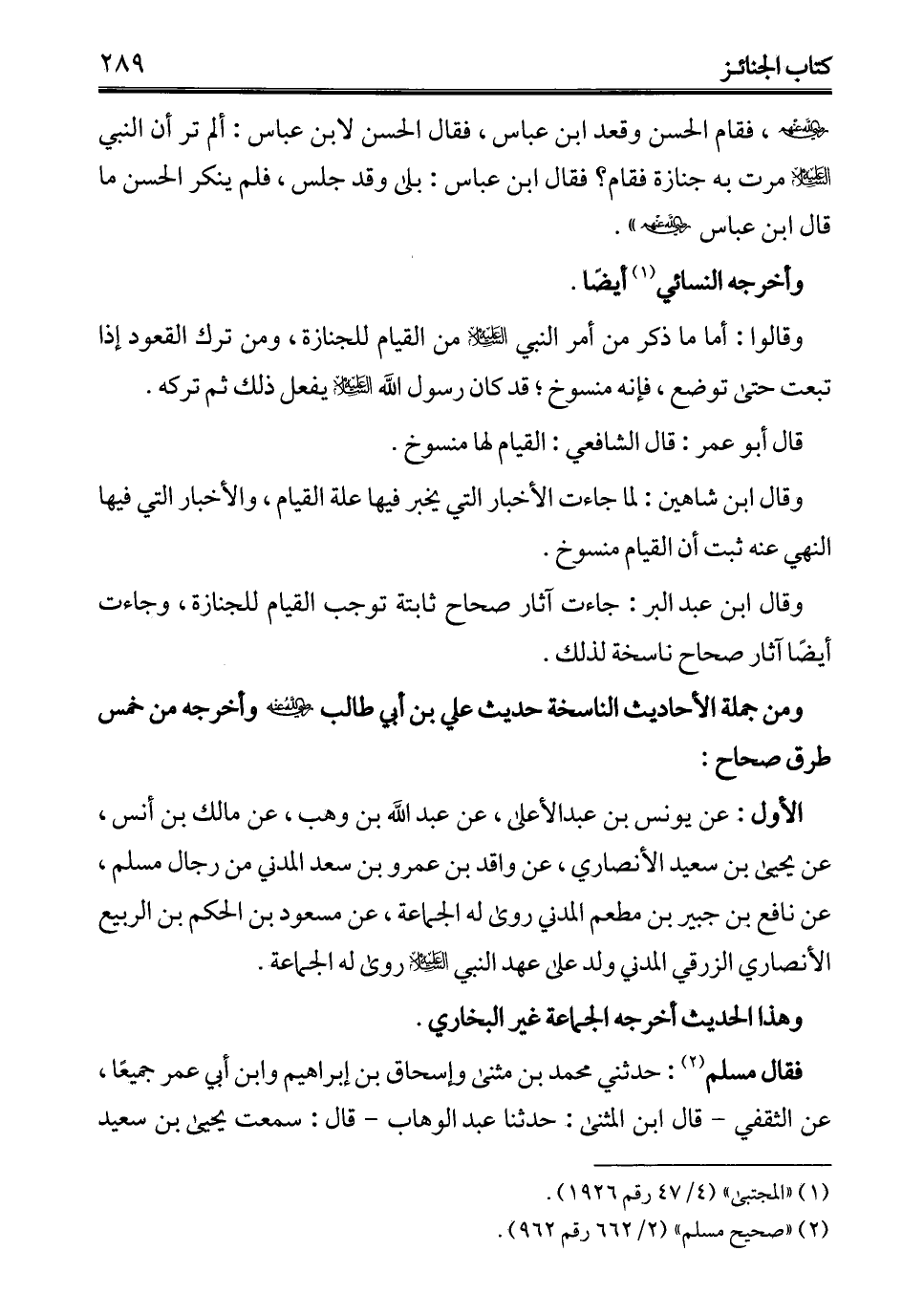 وقال ابن عبد البر: جاءت آثار صحاح ثابتة توجب القيام للجنازة، وجاءت أيضًا آثار صحاح ناسخة لذلك.