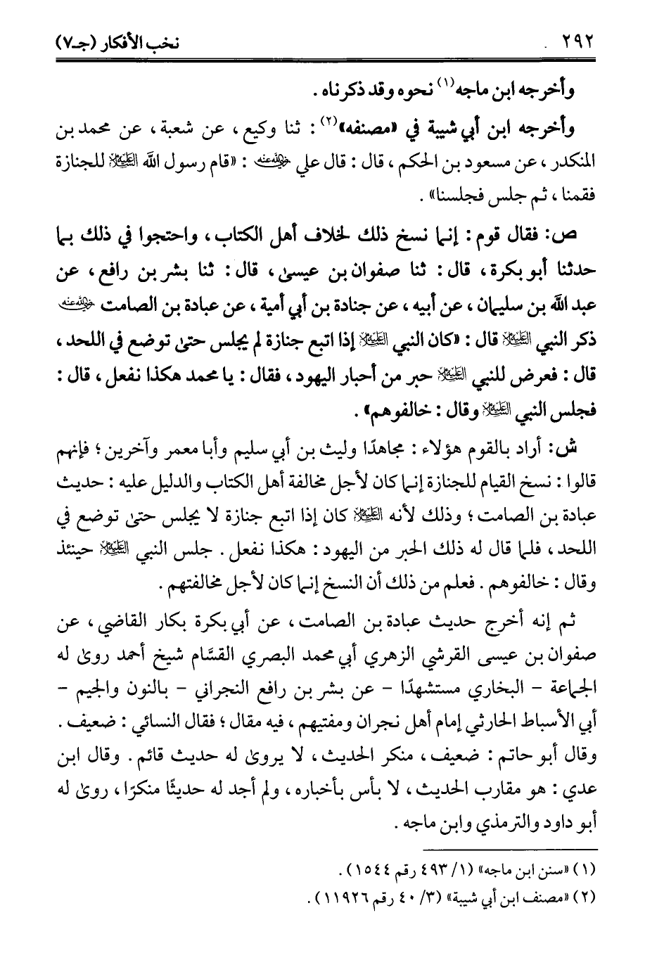 ثم إنه أخرج حديث عبادة بن الصامت، عن أبي بكرة بكار القاضي، عن صفوان بن عيسى القرشي الزهري أبي محمد البصري القسَّام شيخ أحمد روى له الجماعة -البخاري مستشهدًا- عن بشر بن رافع النجراني -بالنون والجيم- أبي الأسباط الحارثي إمام أهل نجران ومفتيهم، فيه مقال؛ فقال النسائي: ضعيف. وقال أبو حاتم: ضعيف، منكر الحديث، لا يروى له حديث قائم. وقال ابن عدي: هو مقارب الحديث، لا بأس بأخباره، ولم أجد له حديثًا منكرًا، روى له أبو داود والترمذي وابن ماجه.
