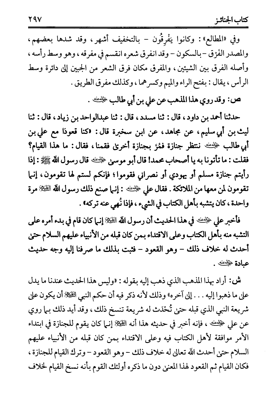 حدثنا أحمد بن داود، قال: ثنا مسدد، قال: ثنا عبد الواحد بن زياد، قال: ثنا ليث بن أبي سليم، عن مجاهد، عن ابن سخبرة قال: "كنا قعودًا مع علي بن أبي طالب - رضي الله عنه - ننتظر جنازة فمُرَّ بجنازة أخرى فقمنا، فقال: ما هذا القيام؟ فقلت: ما تأتونا به يا أصحاب محمد! قال أبو موسى - رضي الله عنه - قال رسول - صلى الله عليه وسلم -: إذا رأيتم جنازة مسلم أو يهودي أو نصراني فقوموا؛ فإنكم لستم لها تقومون، إنما تقومون لمن معها من الملائكة. فقال علي - رضي الله عنه -: إنما صنع ذلك رسول الله - عليه السلام - مرة واحدة، كان يتشبه بأهل الكتاب في الشيء، فإذا نُهي عنه تركه".