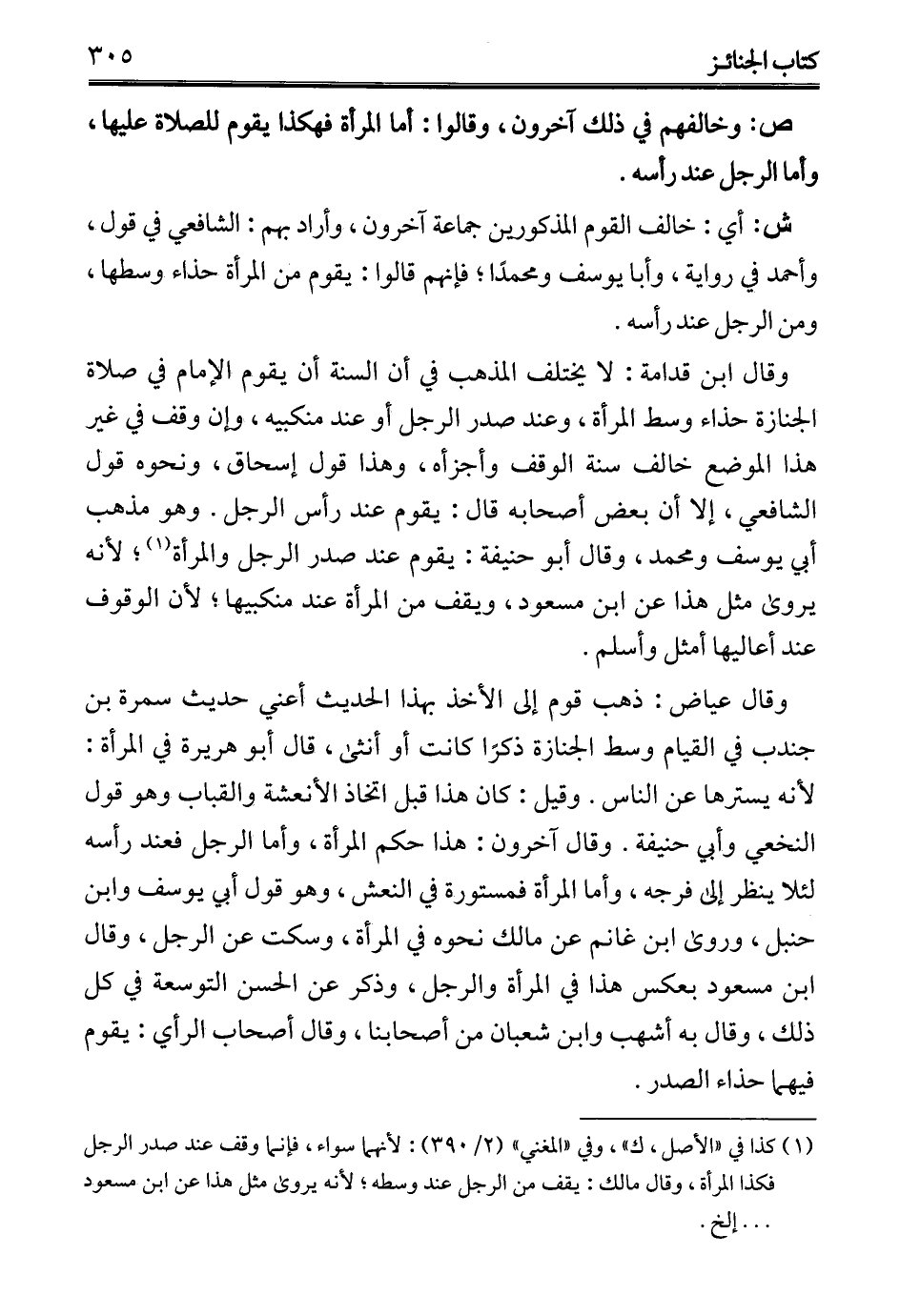 (¬1) كذا في "الأصل، ك"، وفي "المغني" (2/ 390): لأنهما سواء، فإنما وقف عند صدر الرجل فكذا المرأة، وقال مالك: يقف من الرجل عند وسطه؛ لأنه يروى مثل هذا عن ابن مسعود ... إلخ.
