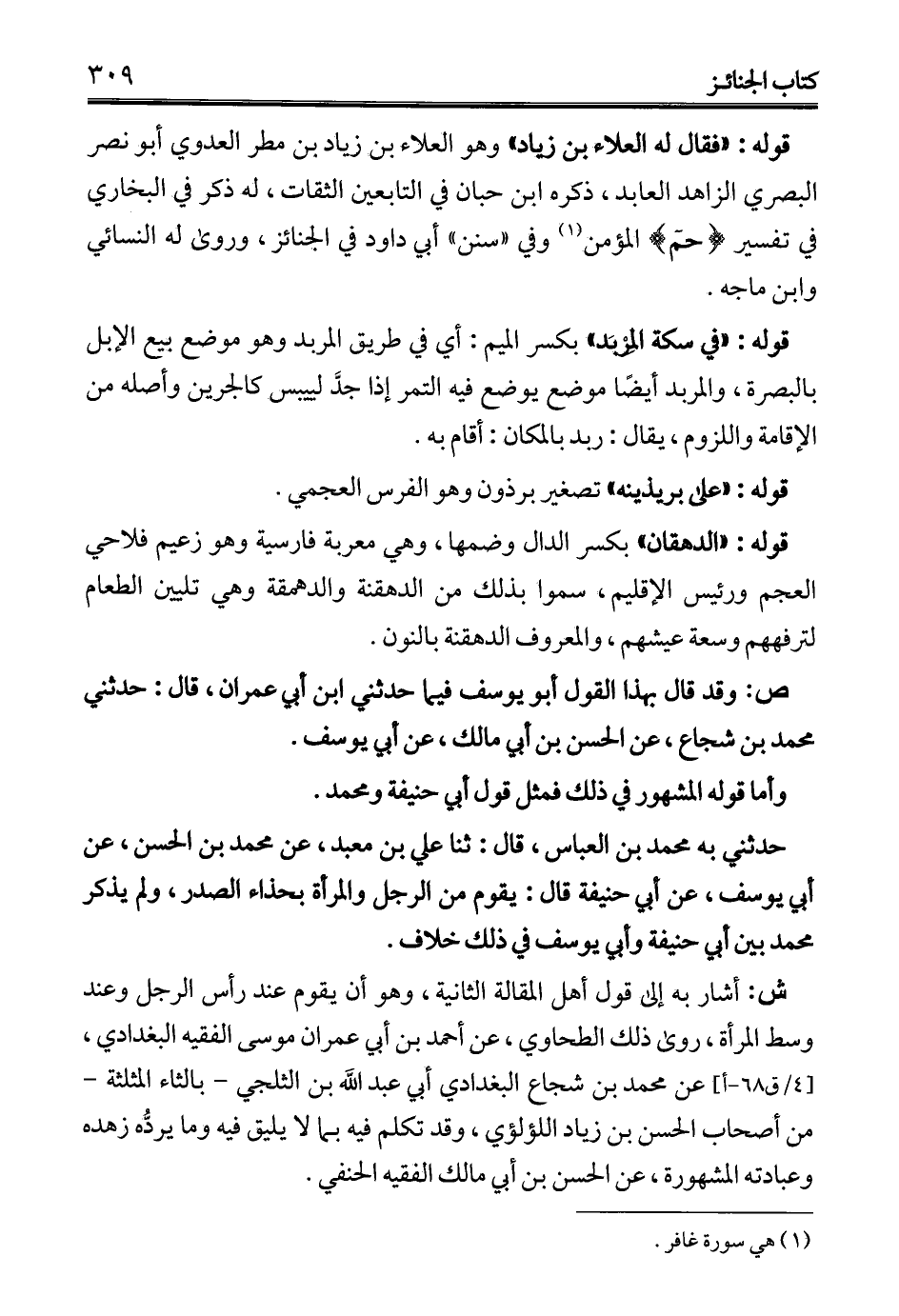 ش: أشار به إلى قول أهل المقالة الثانية، وهو أن يقوم عند رأس الرجل وعند وسط المرأة، روى ذلك الطحاوي، عن أحمد بين أبي عمران موسى الفقيه البغدادي، عن محمد بن شجاع البغدادي أبي عبد الله بن الثلجي -بالثاء المثلثة- من أصحاب الحسن بن زياد اللؤلؤي، وقد تكلم فيه بما لا يليق فيه وما يردُّه زهده وعبادته المشهورة، عن الحسن بن أبي مالك الفقيه الحنفي.