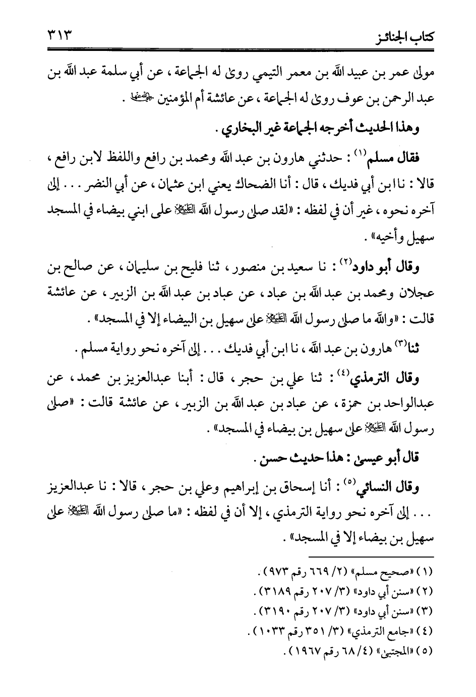 وقال الترمذي (¬4): ثنا علي بن حجر، قال: أبنا عبد العزيز بن محمد، عن عبد الواحد بن حمزة، عن عباد بن عبد الله بن الزبير، عن عائشة قالت: "صلى رسول الله - عليه السلام - على سهيل بن بيضاء في المسجد".