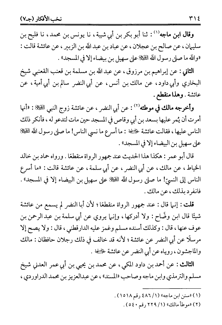 قال أبو عمر: هكذا هذا الحديث عند جمهور الرواة منقطعًا. ورواه حماد بن خالد الخياط، عن مالك، عن أبي النضر، عن أبي سلمة، عن عائشة قالت: "ما أسرع الناس إلى النسيّ! ما صلى رسول الله - عليه السلام - على سهيل بن البيضاء إلا في المسجد". فانفرد بذلك، عن مالك.