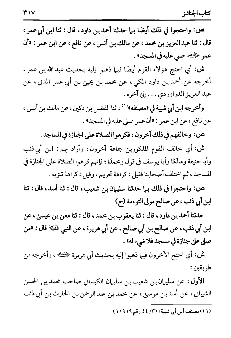 ص: واحتجوا في ذلك أيضًا بما حدثنا أحمد بن داود، قال: ثنا ابن أبي عمر، قال: ثنا عبد العزيز بن محمد، عن مالك بن أنس، عن نافع، عن ابن عمر: "أن عمر - رضي الله عنه - صلي عليه في المسجد".