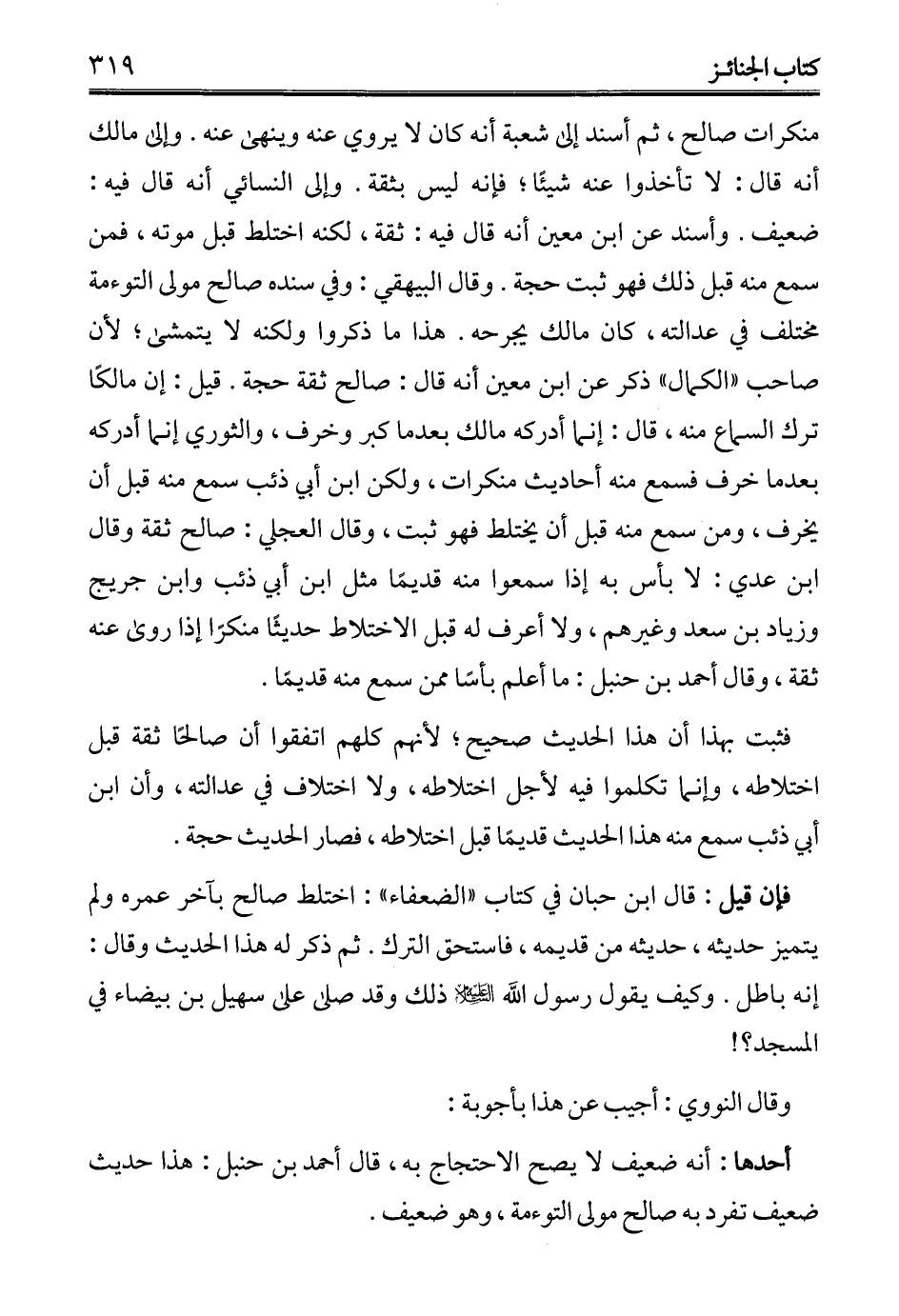 منكرات صالح، ثم أسند إلى شعبة أنه كان لا يروي عنه وينهى عنه. وإلى مالك أنه قال: لا تأخذوا عنه شيئًا؛ فإنه ليس بثقة. وإلى النسائي أنه قال فيه: ضعيف. وأسند عن ابن معين أنه قال فيه: ثقة، لكنه اختلط قبل موته، فمن سمع منه قبل ذلك فهو ثبت حجة. وقال البيهقي: وفي سنده صالح مولى التوءمة مختلف في عدالته، كان مالك يجرحه. هذا ما ذكروا ولكنه لا يتمشى؛ لأن