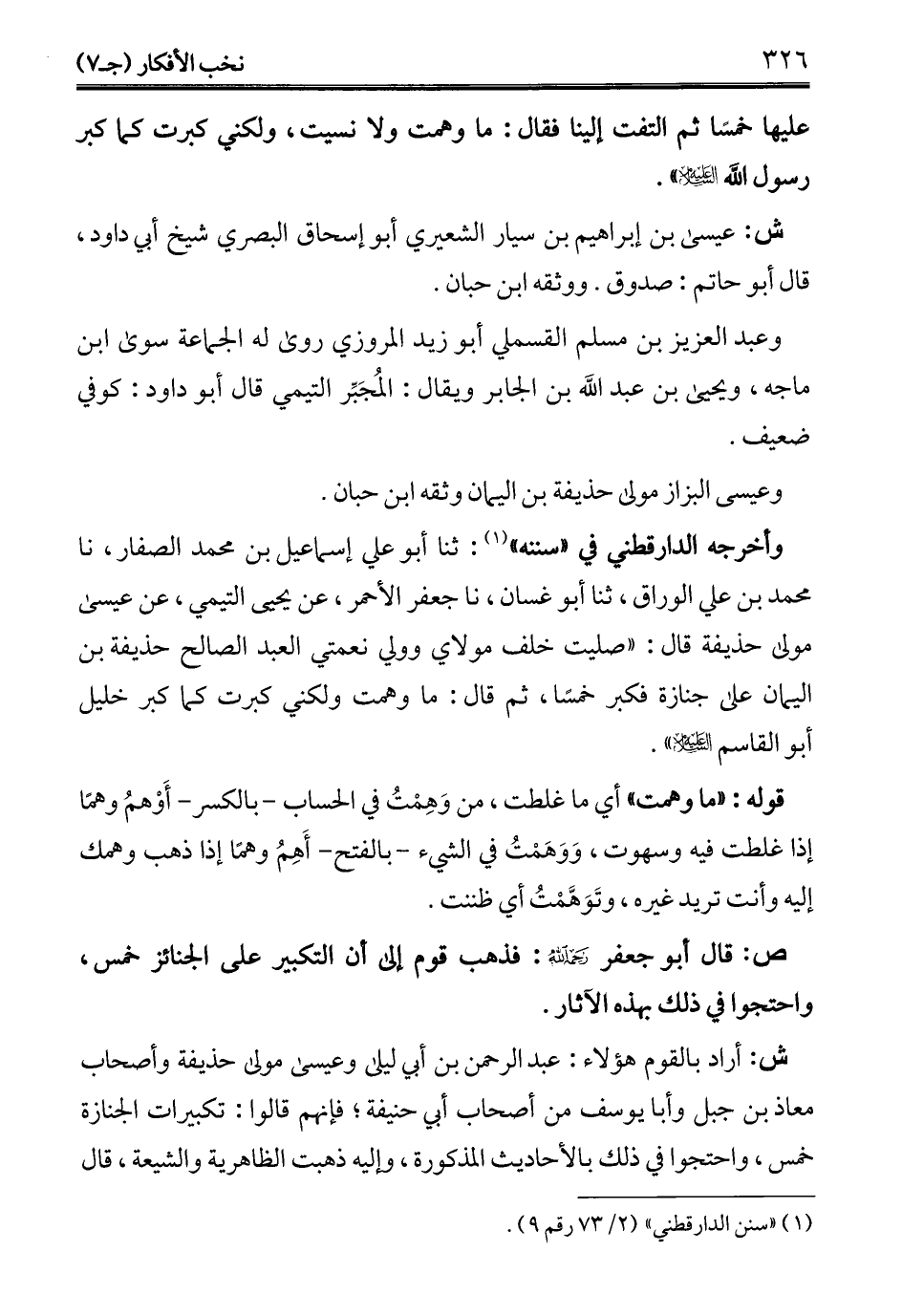 وأخرجه الدارقطني في "سننه" (¬1): ثنا أبو علي إسماعيل بن محمد الصفار، نا محمد بن علي الوراق، ثنا أبو غسان، نا جعفر الأحمر، عن يحيى التيمي، عن عيسى مولى حذيفة قال: "صليت خلف مولاي وولي نعمتي العبد الصالح حذيفة بن اليمان على جنازة فكبر خمسًا، ثم قال: ما وهمت ولكني كبرت كما كبر خليل أبو القاسم - عليه السلام -".