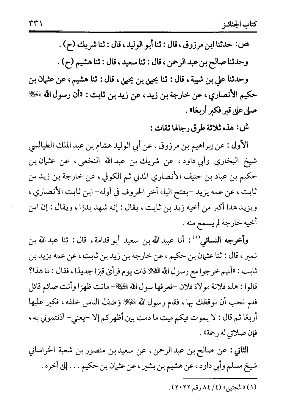 وحدثنا علي بن شيبة، قال: ثنا يحيى بن يحيى، قال: ثنا هشيم، عن عثمان بن حكيم الأنصاري، عن خارجة بن زيد، عن زيد بن ثابت: "أن رسول الله - عليه السلام - صلى على قبر فكبر أربعًا".