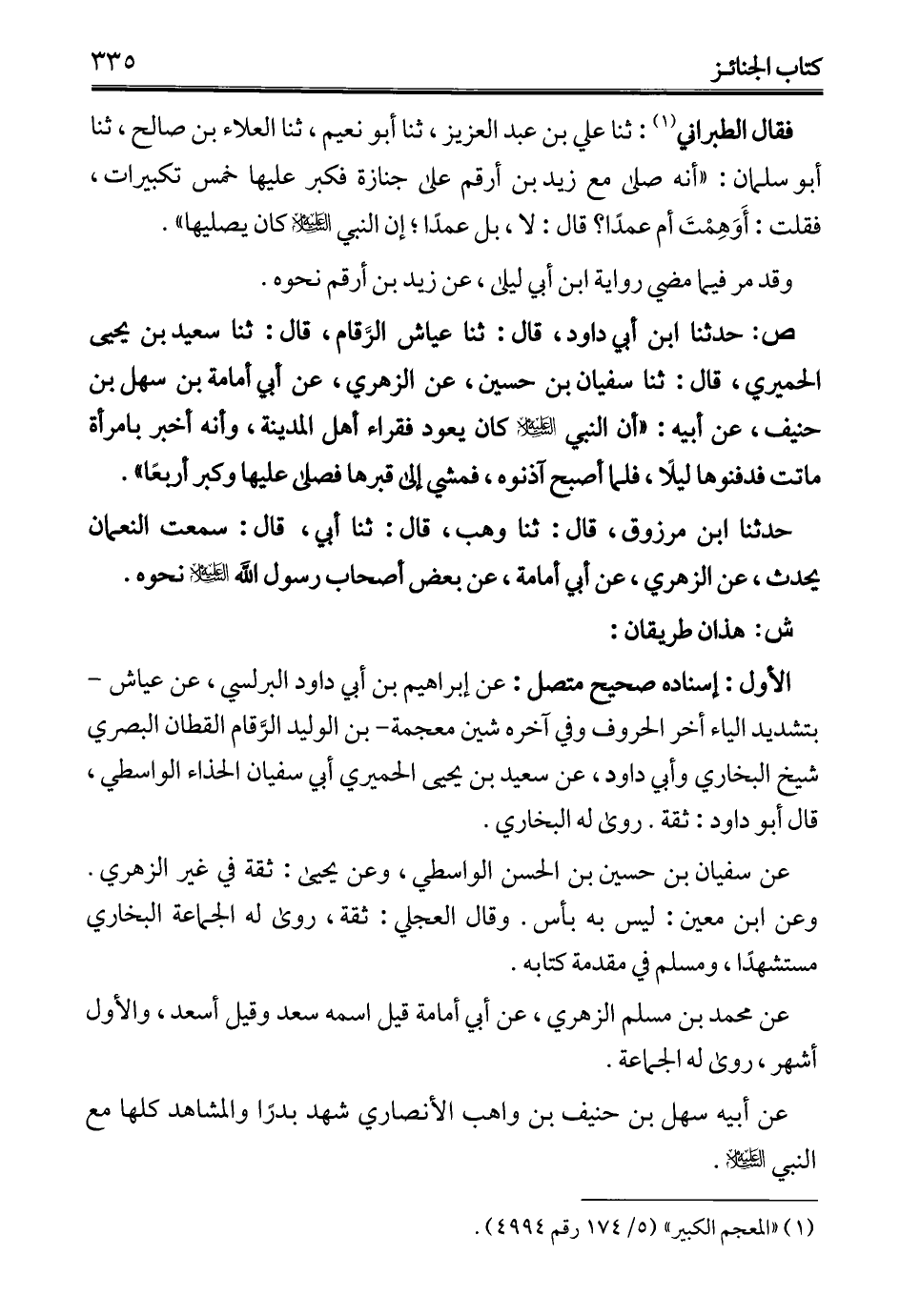 فقال الطبراني (¬1): ثنا علي بن عبد العزيز، ثنا أبو نعيم، ثنا العلاء بن صالح، ثنا أبو سلمان: "أنه صلى مع زيد بن أرقم على جنازة فكبر عليها خمس تكبيرات، فقلت: أَوَهِمْتَ أم عمدًا؟ قال: لا، بل عمدًا؛ إن النبي - عليه السلام - كان يصليها".