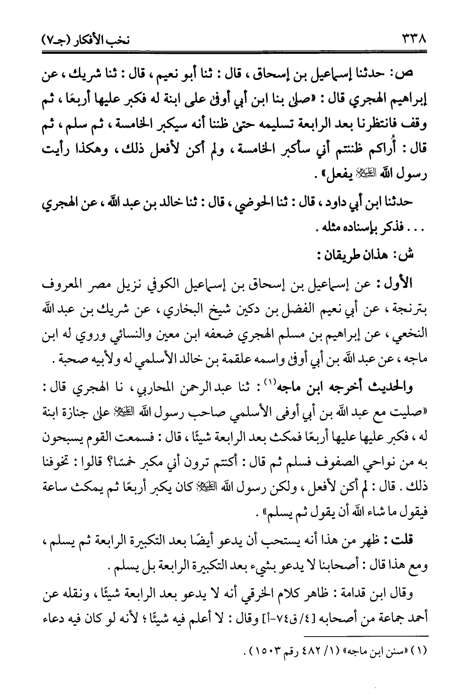 ص: حدثنا إسماعيل بن إسحاق، قال: ثنا أبو نعيم، قال: ثنا شريك، عن إبراهيم الهجري قال: "صلى بنا ابن أبي أوفى على ابنة له فكبر عليها أربعًا، ثم وقف فانتظرنا بعد الرابعة تسليمه حتى ظننا أنه سيكبر الخامسة، ثم سلم، ثم قال: أُراكم ظننتم أني سأكبر الخامسة، ولم كن لأفعل ذلك، وهكذا رأيت رسول الله - عليه السلام - يفعل".