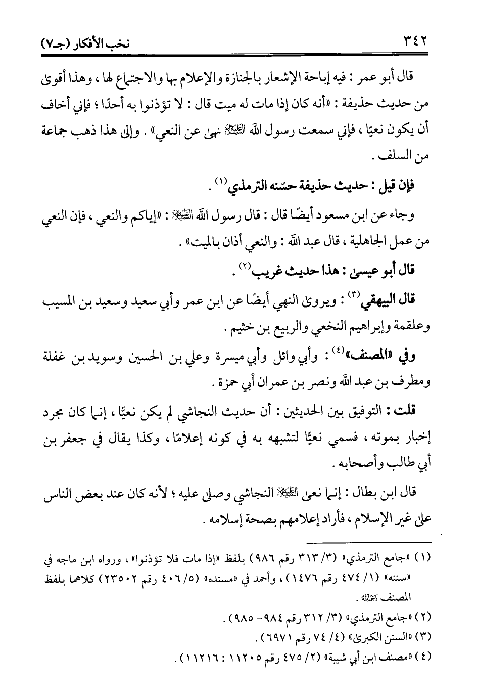 (¬1) "جامع الترمذي" (3/ 313 رقم 986) بلفظ "إذا مات فلا تؤذنوا"، ورواه ابن ماجه في "سننه" (1/ 474 رقم 1476)، وأحمد في "مسنده" (5/ 406 رقم 23502) كلاهما بلفظ المصنف -رحمه الله-.
