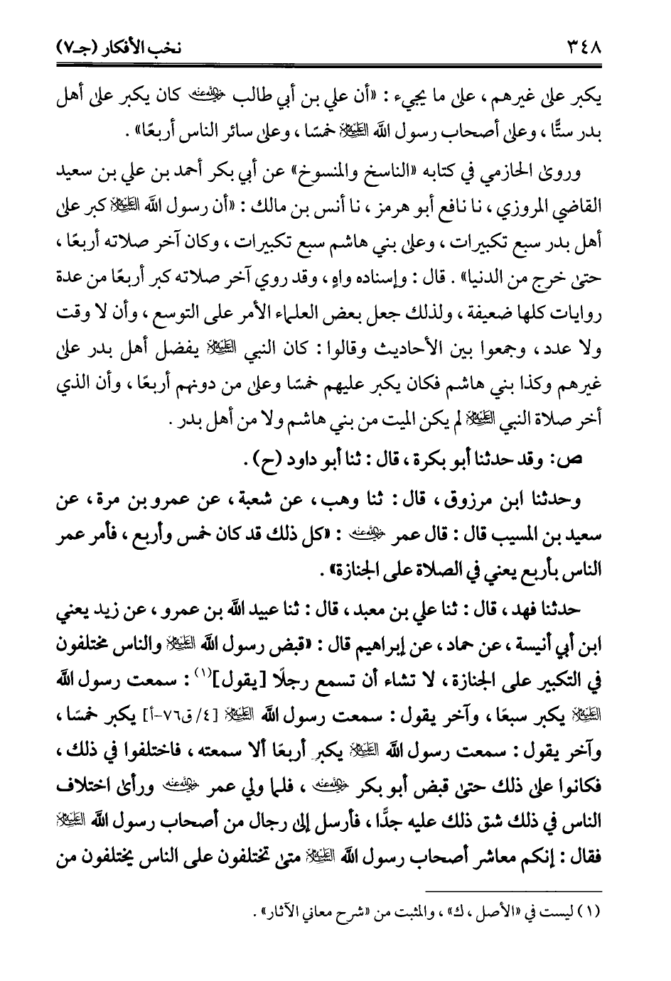 وروى الحازمي في كتابه "الناسخ والمنسوخ" عن أبي بكر أحمد بن علي بن سعيد القاضي المروزي، نا نافع أبو هرمز، نا أنس بن مالك: "أن رسول الله - عليه السلام - كبر على أهل بدر سبع تكبيرات، وعلى بني هاشم سبع تكبيرات، وكان آخر صلاته أربعًا، حتى خرج من الدنيا". قال: وإسناده واهٍ، وقد روي آخر صلاته كبر أربعًا من عدة روايات كلها ضعيفة، ولذلك جعل بعض العلماء الأمر على التوسع، وأن لا وقت ولا عدد، وجمعوا بين الأحاديث وقالوا: كان النبي - عليه السلام - يفضل أهل بدر على غيرهم وكذا بني هاشم فكان يكبر عليهم خمسًا وعلى من دونهم أربعًا، وأن الذي أخر صلاة النبي - عليه السلام - لم يكن الميت من بني هاشم ولا من أهل بدر.