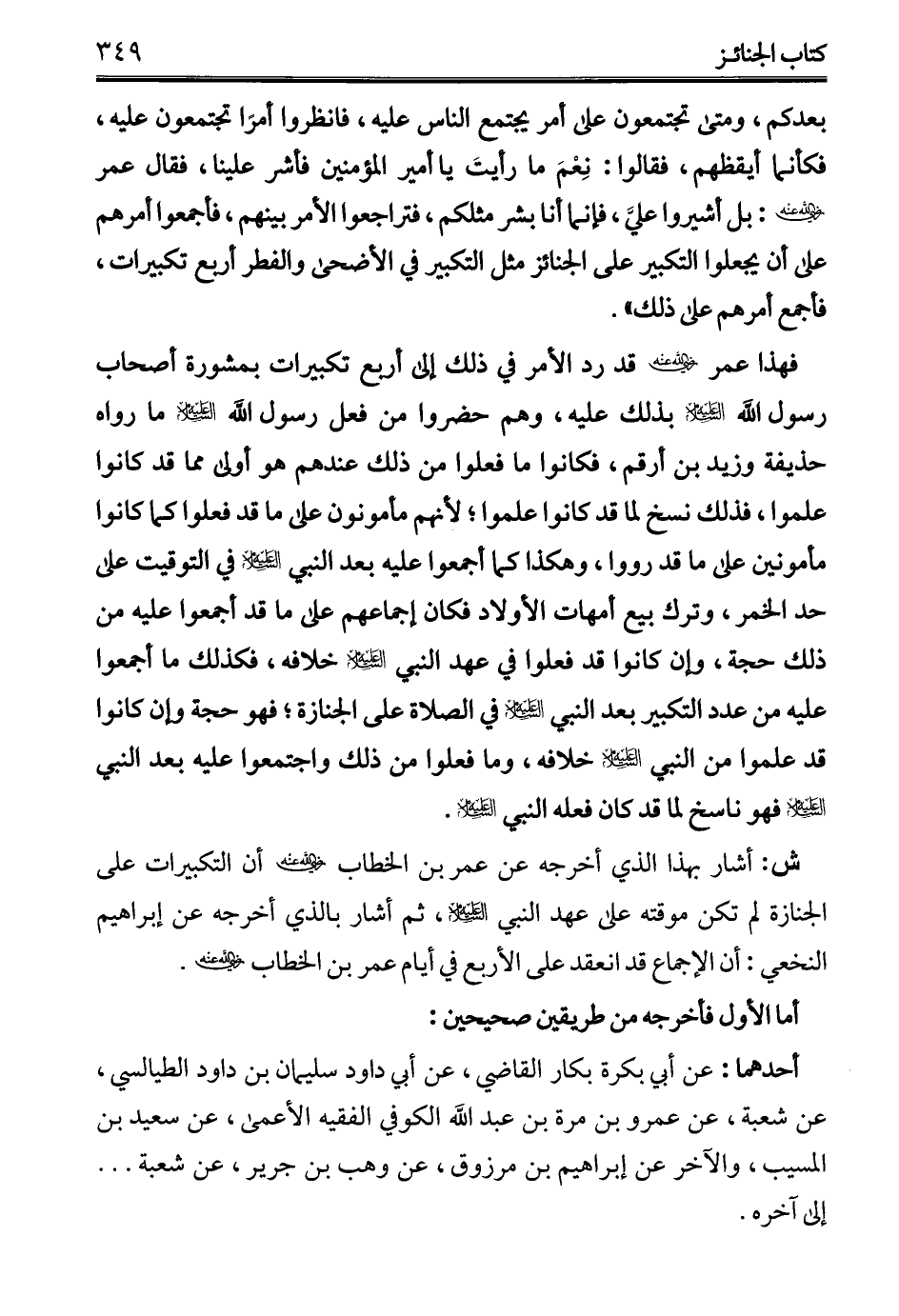 بعدكم، ومتى تجتمعون على أمر يجتمع الناس عليه، فانظروا أمرًا تجتمعون عليه، فكأنما أيقظهم، فقالوا: نِعْمَ ما رأيتَ يا أمير المؤمنين فأشر علينا، فقال عمر - رضي الله عنه -: بل أشيروا عليَّ، فإنما أنا بشر مثلكم، فتراجعوا الأمر بينهم، فأجمعوا أمرهم على أن يجعلوا التكبير على الجنائز مثل التكبير في الأضحى والفطر أربع تكبيرات، فأجمع أمرهم على ذلك".