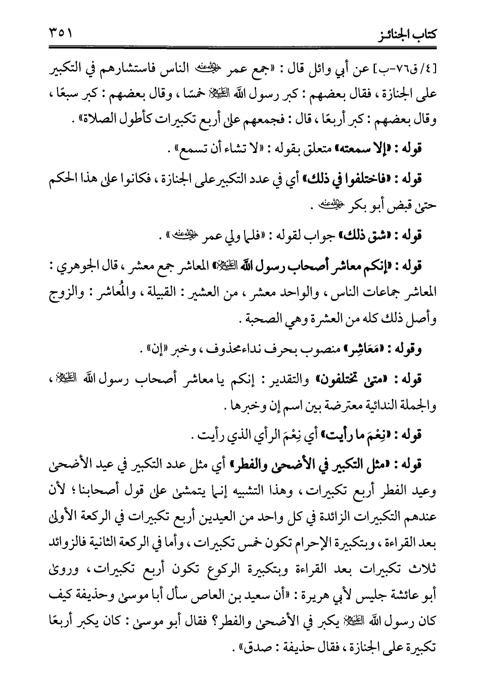 عن أبي وائل قال: "جمع عمر - رضي الله عنه - الناس فاستشارهم في التكبير على الجنازة، فقال بعضهم: كبر رسول الله - عليه السلام - خمسًا، وقال بعضهم: كبر سبعًا، وقال بعضهم: كبر أربعًا، قال: فجمعهم على أربع تكبيرات كأطول الصلاة".