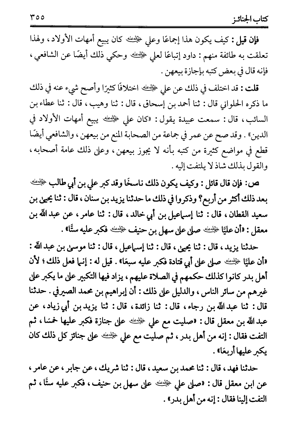 قلت: قد اختلف في ذلك عن علي - رضي الله عنه - اختلافًا كثيرًا وأصح شيء عنه في ذلك ما ذكره الحلواني قال: ثنا أحمد بن إسحاق، قال: ثنا وهيب، قال: ثنا عطاء بن السائب، قال: سمعت عبيدة يقول: "كان علي - رضي الله عنه - يبيع أمهات الأولاد في الدين". وقد صح عن عمر في جماعة من الصحابة المنع من بيعهن، والشافعي أيضًا قطع في مواضع كثيرة من كتبه بأنه لا يجوز بيعهن، وعلى ذلك عامة أصحابه، والقول بذلك شاذ لا يلتفت إليه.