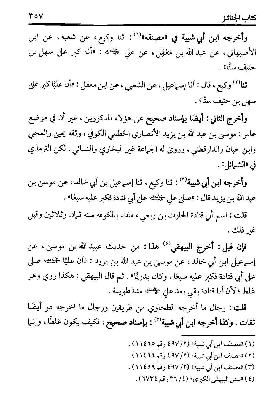 ثنا (¬2) وكيع، قال: أنا إسماعيل، عن الشعبي، عن ابن معقل: "أن عليًّا كبر على سهل بن حنيف ستًّا".
