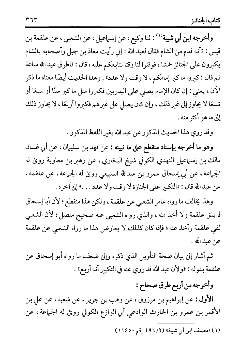وهو ما أخرجه بإسناد منقطع على ما نبينه: عن فهد بن سليمان، عن أبي غسان مالك بن إسماعيل النهدي الكوفي شيخ البخاري، عن زهير بن معاوية روى له الجماعة، عن أبي إسحاق عمرو بن عبد الله السبيعي روى له الجماعة، عن علقمة، عن عبد الله قال: "التكبير على الجنازة لا وقت ولا عدد ... " إلى آخره.