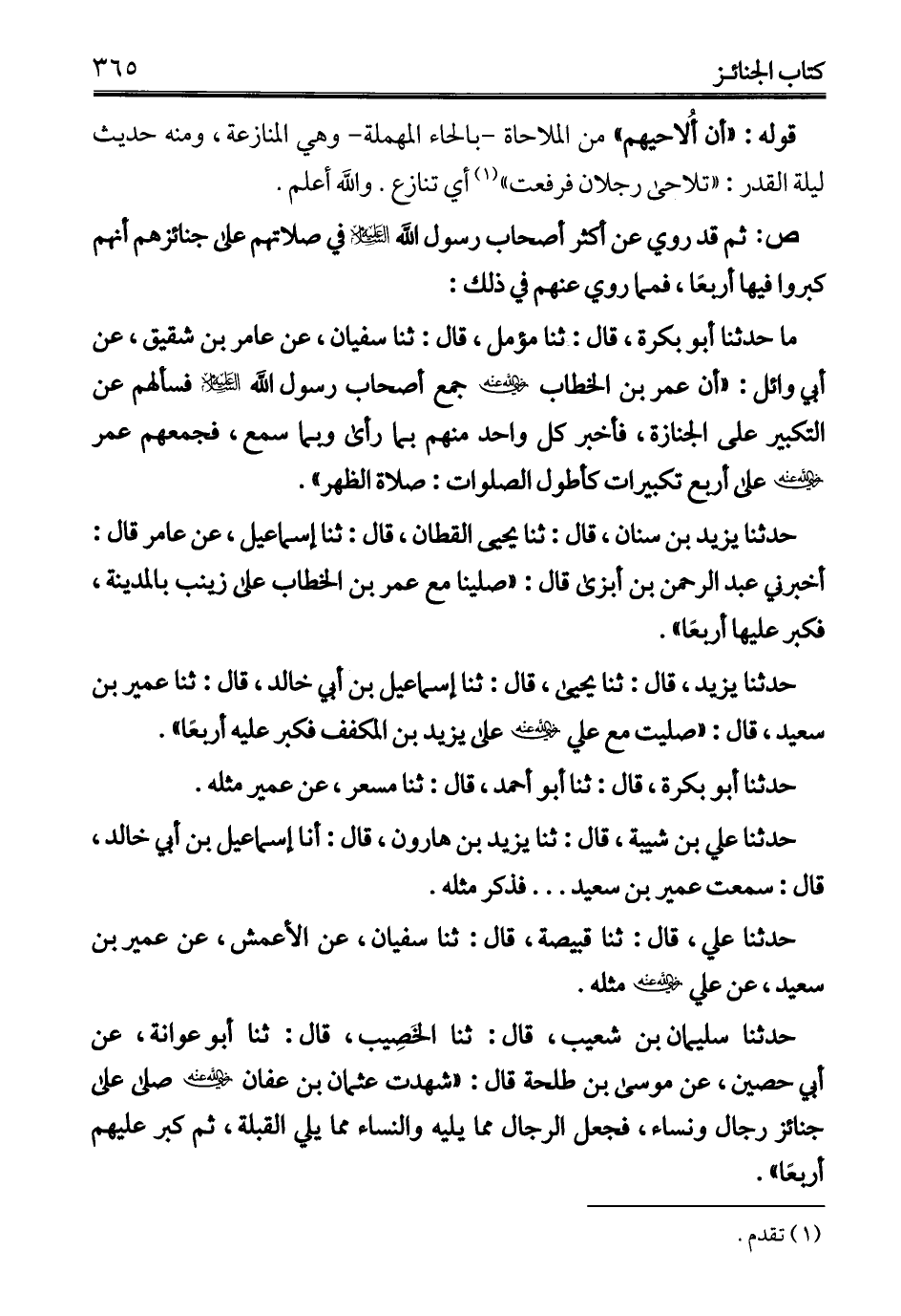حدثنا يزيد، قال: ثنا يحيى، قال: ثنا إسماعيل بن أبي خالد، قال: ثنا عمير بن سعيد، قال: "صليت مع علي - رضي الله عنه - على يزيد بن المكفف فكبر عليه أربعًا".