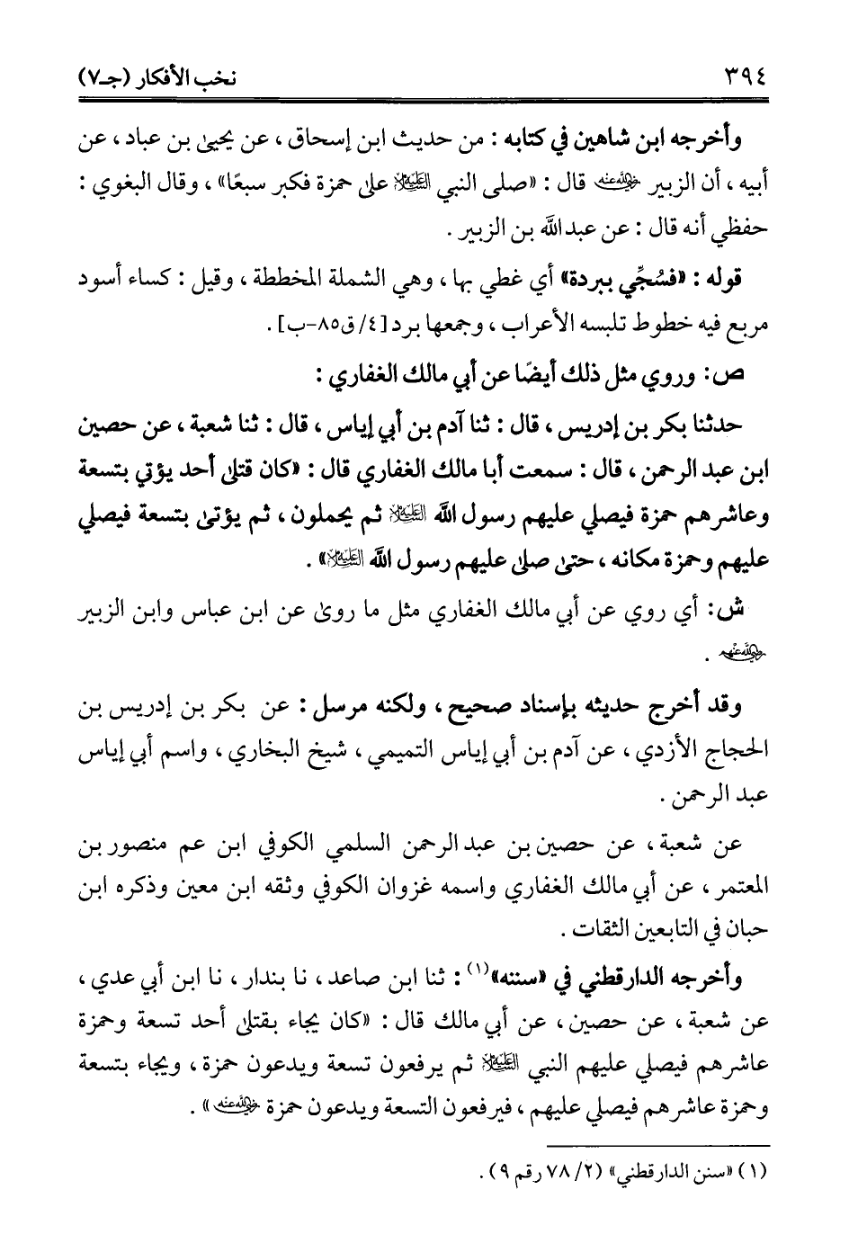 حدثنا بكر بن إدريس، قال: ثنا آدم بن أبي إياس، قال: ثنا شعبة، عن حصين ابن عبد الرحمن، قال: سمعت أبا مالك الغفاري قال: "كان قتلى أحد يؤتي بتسعة وعاشرهم حمزة فيصلي عليهم رسول الله - عليه السلام - ثم يحملون، ثم يؤتى بتسعة فيصلي عليهم وحمزة مكانه، حتى صلى عليهم رسول الله - عليه السلام -".