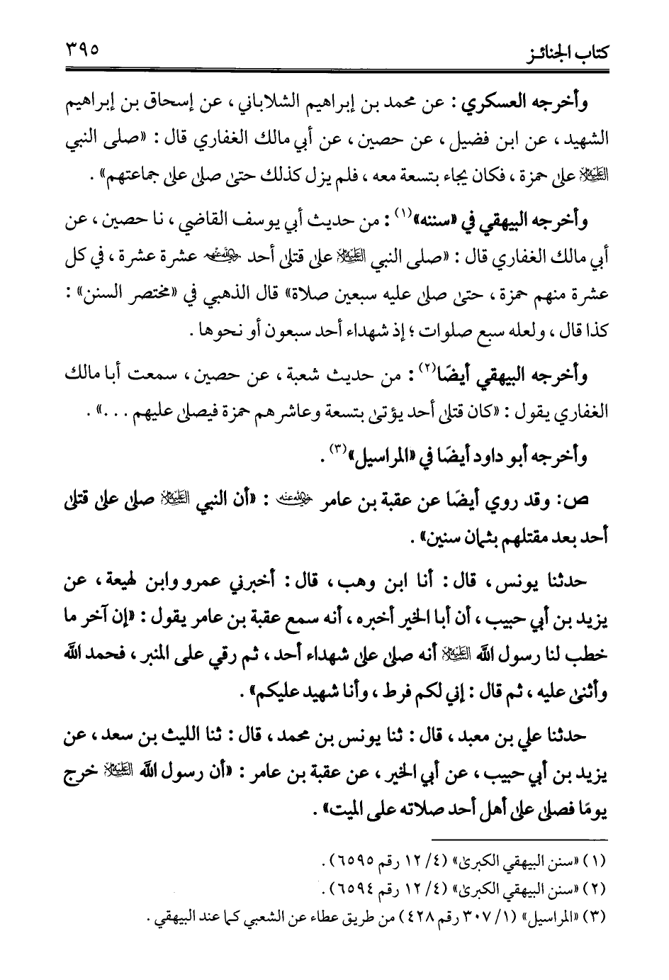 وأخرجه العسكري: عن محمد بن إبراهيم الشلاباني، عن إسحاق بن إبراهيم الشهيد، عن ابن فضيل، عن حصين، عن أبي مالك الغفاري قال: "صلى النبي - عليه السلام - على حمزة، فكان يجاء بتسعة معه، فلم يزل كذلك حتى صلى على جماعتهم".