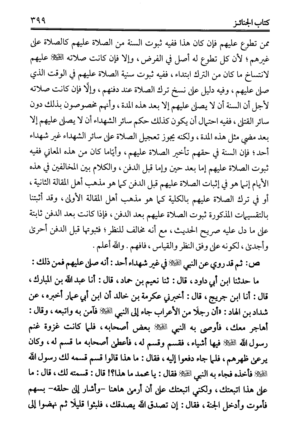 ص: ثم قد روي عن النبي - عليه السلام - في غير شهداء أحد: أنه صلى عليهم فمن ذلك: ما حدثنا ابن أبي داود، قال: ثنا نعيم بن حماد، قال: أنا عبد الله بن المبارك، قال: أنا ابن جريج، قال: أخبرني عكرمة بن خالد أن ابن أني عمار أخبره، عن شداد بن الهاد: "أن رجلًا من الأعراب جاء إلى النبي - عليه السلام - فآمن به واتبعه، وقال: أهاجر معك، فأوصى به النبي - عليه السلام - بعض أصحابه، فلما كانت غزوة غنم رسول الله - عليه السلام - فيها أشياء، فقسم وقسم له، فأعطى أصحابه ما قسم له، وكان يرعى ظهرهم، فلما جاء دفعوا إليه، فقال: ما هذا قالوا قسم قسمه لك رسول الله - عليه السلام - فأخذه فجاء به النبي - عليه السلام - فقال: يا محمد ما هذا؟! قال: قسمته لك، قال: ما على هذا اتبعتك، ولكني اتبعتك على أن أرمى ها هنا -وأشار إلى حلقه- بسهم فأموت وأدخل الجنة، فقال: إن تصدق الله يصدقك، فلبثوا قليلًا ثم نهضوا إلى