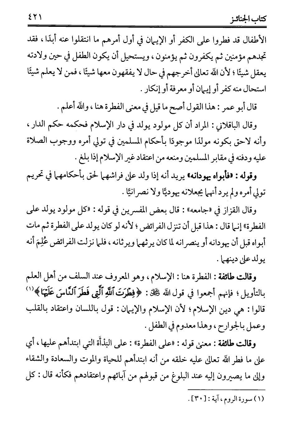 وقال الباقلاني: المراد أن كل مولود يولد في دار الإسلام فحكمه حكم الدار، وأنه لاحق بكونه مولدًا موجودًا بأحكام المسلمين في تولي أمره ووجوب الصلاة عليه ودفنه في مقابر المسلمين ومنعه من اعتقاد غير الإسلام إذا بلغ.