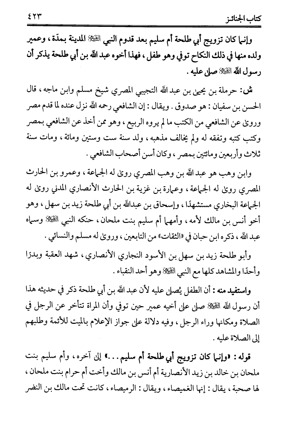 وإنما كان تزويج أبي طلحة أم سليم بعد قدوم النبي - عليه السلام - المدينة بمدّة، وعمير ولده منها في ذلك النكاح توفي وهو طفل، فهذا أخوه عبد الله بن أبي طلحة يذكر أن رسول الله - عليه السلام - صلى عليه.