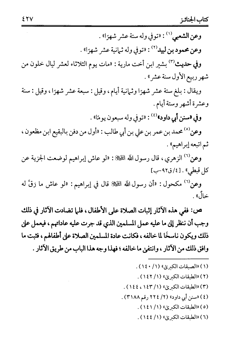 ص: ففي هذه الآثار إثبات الصلاة على الأطفال، فلما تضادت الآثار في ذلك وجب أن ننظر إلى ما عليه عمل المسلمين الذي قد جرت عليه عاداتهم، فيعمل على ذلك ويكون ناسخًا لما خالفه، فكانت عادة المسلمين الصلاة على أطفالهم، فثبت ما وافق ذلك من الآثار، وانتفى ما خالفه؛ فهذا وجه هذا الباب من طريق الآثار.
