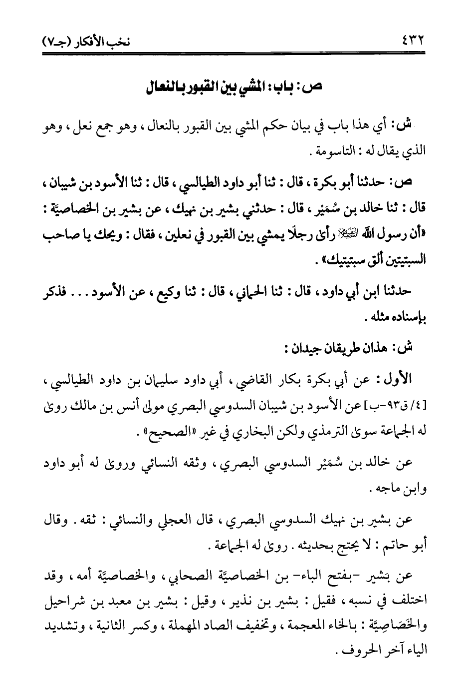 ص: حدثنا أبو بكرة، قال: ثنا أبو داود الطيالسي، قال: ثنا الأسود بن شيبان، قال: ثنا خالد بن سُمَيْر، قال: حدثني بشير بن نهيك، عن بشير بن الخصاصيَّة: "أن رسول الله - عليه السلام - رأى رجلًا يمشي بين القبور في نعلين، فقال: ويحك يا صاحب السبتيتين ألق سبتيتيك".
