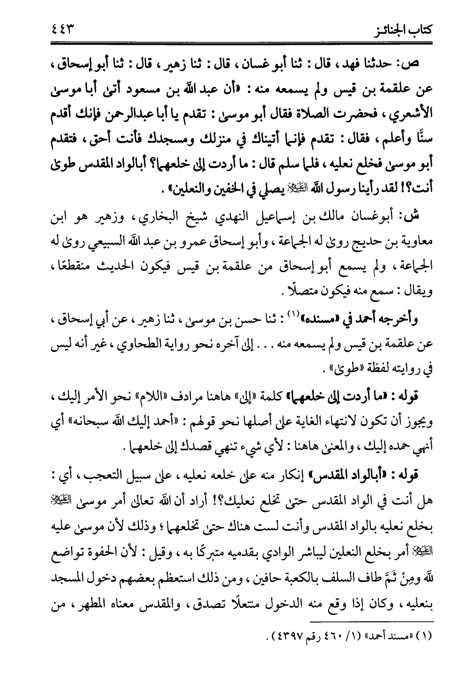 ص: حدثنا فهد، قال: ثنا أبو غسان، قال: ثنا زهير، قال: ثنا أبو إسحاق، عن علقمة بن قيس ولم يسمعه منه: "أن عبد الله بن مسعود أتى أبا موسى الأشعري، فحضرت الصلاة فقال أبو موسى: تقدم يا أبا عبد الرحمن فإنك أقدم سنًّا وأعلم، فقال: تقدم فإنما أتيناك في منزلك ومسجدك فأنت أحق، فتقدم أبو موسى فخلع نعليه، فلما سلم قال: ما أردت إلى خلعهما؟ أبالواد المقدس طوى أنت؟! لقد رأينا رسول الله - عليه السلام - يصلي في الخفين والنعلين".
