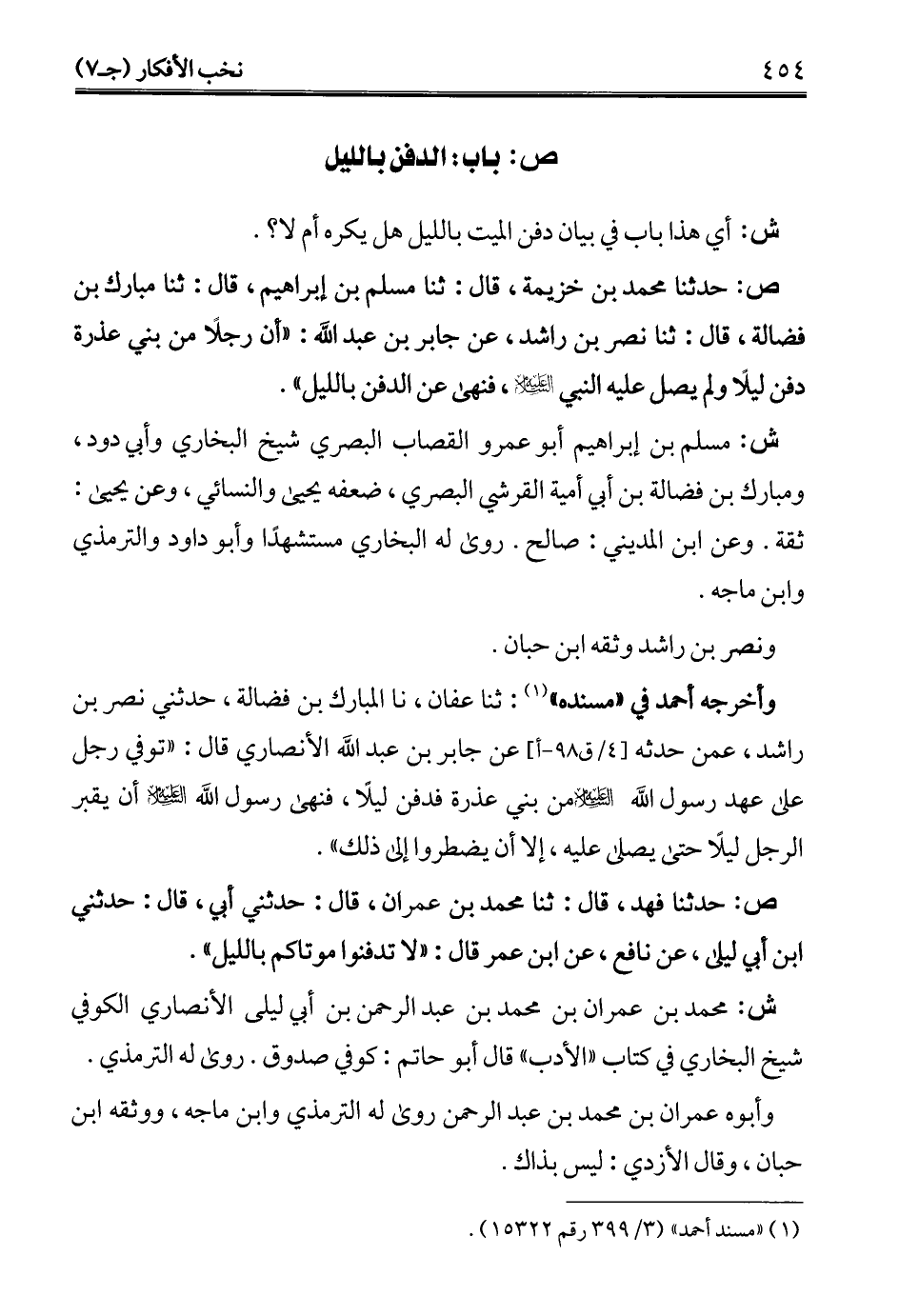 ص: حدثنا محمَّد بن خزيمة، قال: ثنا مسلم بن إبراهيم، قال: ثنا مبارك بن فضالة، قال: ثنا نصر بن راشد، عن جابر بن عبد الله: "أن رجلًا من بني عذرة دفن ليلًا ولم يصل عليه النبي - عليه السلام -، فنهى عن الدفن بالليل".