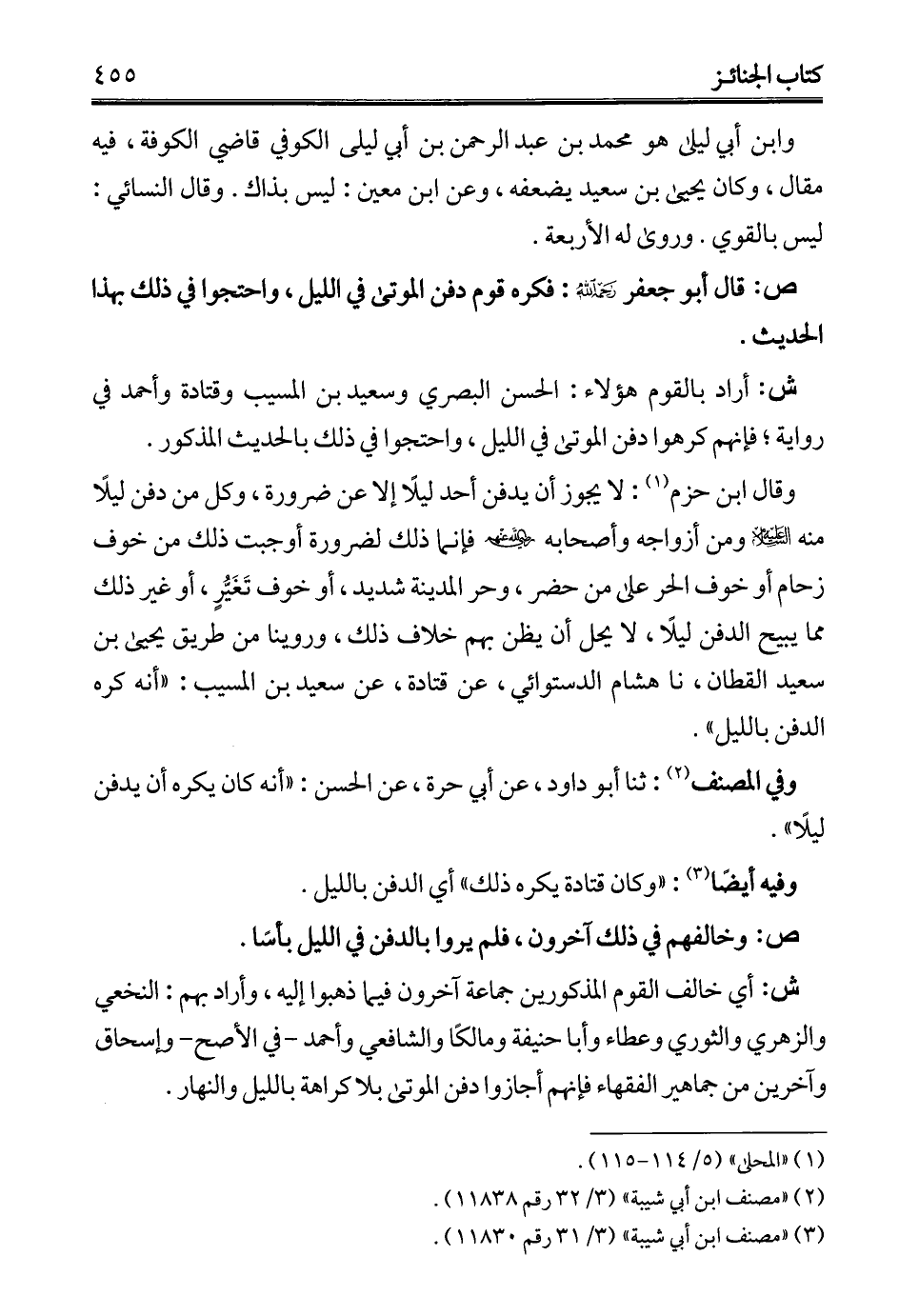 ص: قال أبو جعفر -رحمه الله -: فكره قوم دفن الموتى في الليل، واحتجوا في ذلك بهذا الحديث.
