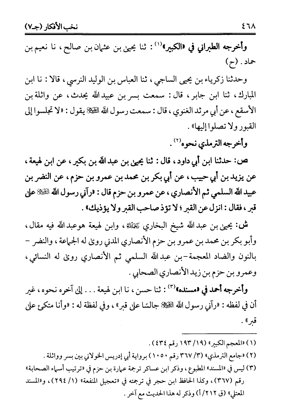 ص: حدثنا ابن أبي داود، قال: ثنا يحيى بن عبد الله بن بكير، عن ابن لهيعة، عن يزيد بن أبي حبيب، عن أبي بكر بن محمد بن عمرو بن حزم، عن النضر بن عبيد الله السلمي ثم الأنصاري، عن عمرو بن حزم قال: "رآني رسول الله - عليه السلام - على قبر، فقال: انزل عن القبر؛ لا تؤذ صاحب القبر ولا يؤذيك".