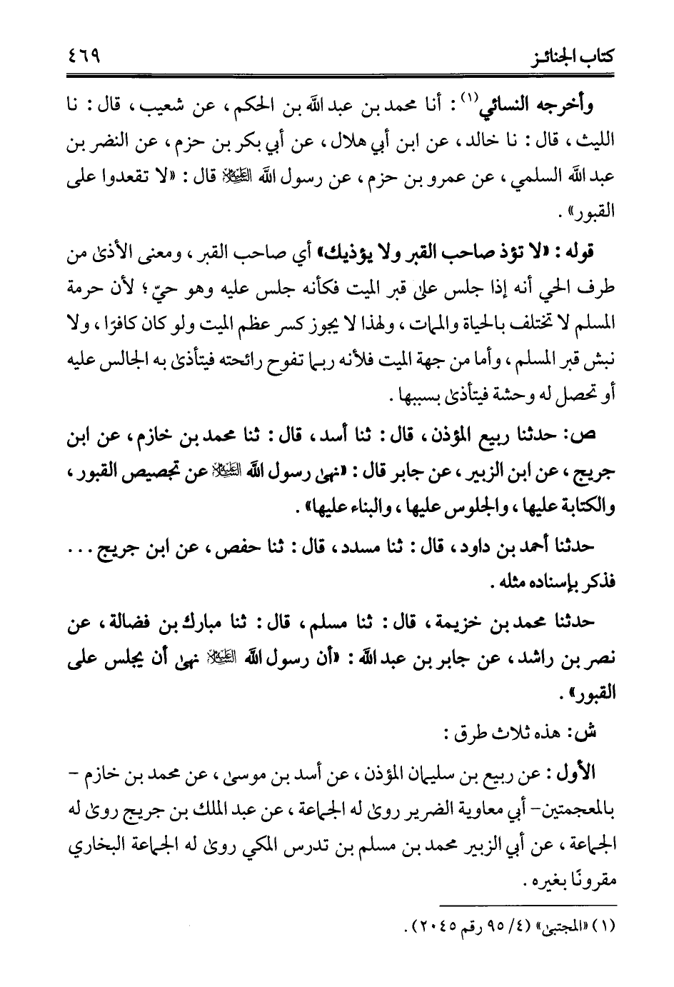 حدثنا محمد بن خزيمة، قال: ثنا مسلم، قال: ثنا مبارك بن فضالة، عن نصر بن راشد، عن جابر بن عبد الله: "أن رسول الله - عليه السلام - نهى أن يجلس على القبور".