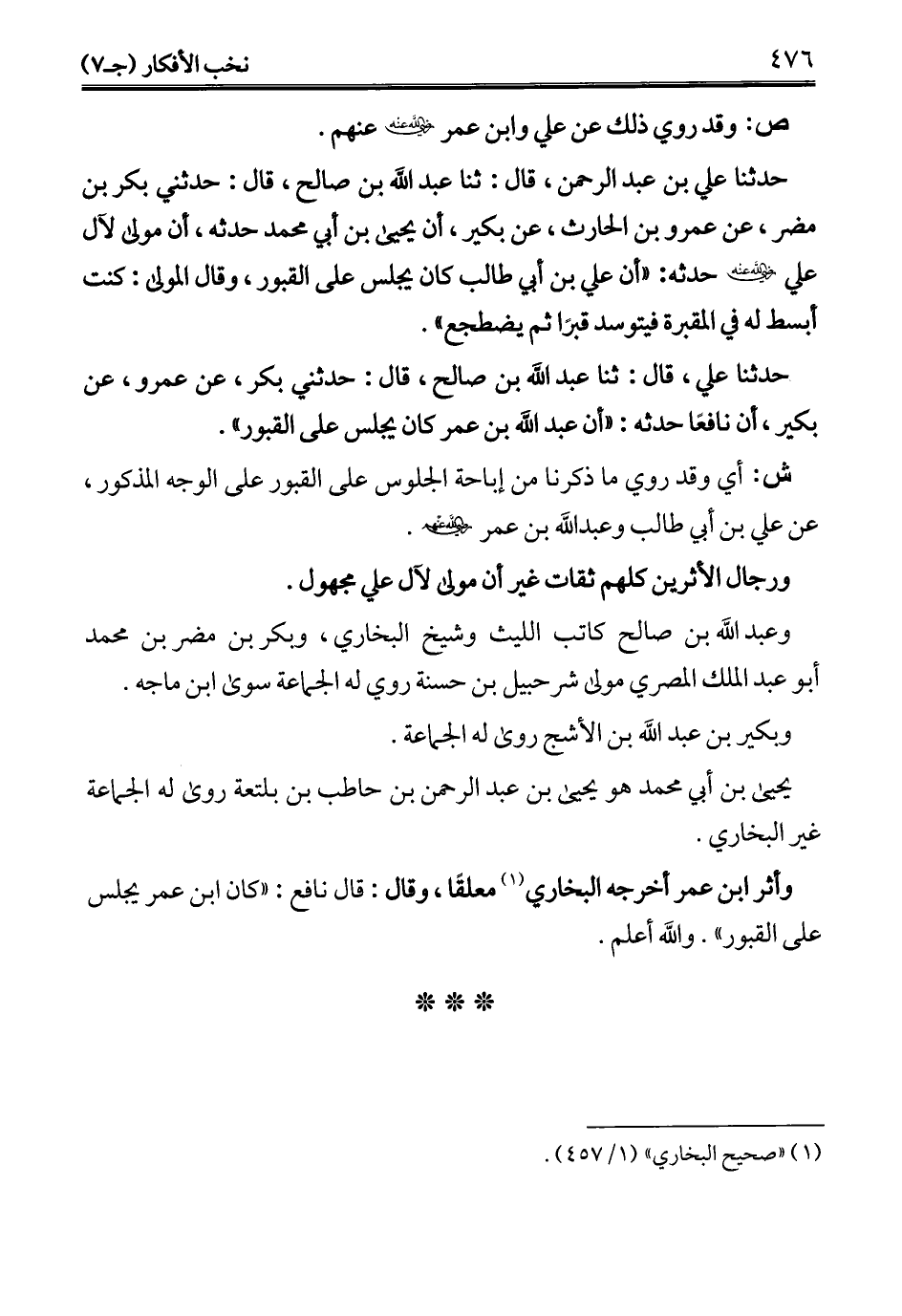 حدثنا علي، قال: ثنا عبد الله بن صالح، قال: حدثني بكر، عن عمرو، عن بكير، أن نافعًا حدثه: "أن عبد الله بن عمر كان يجلس على القبور".