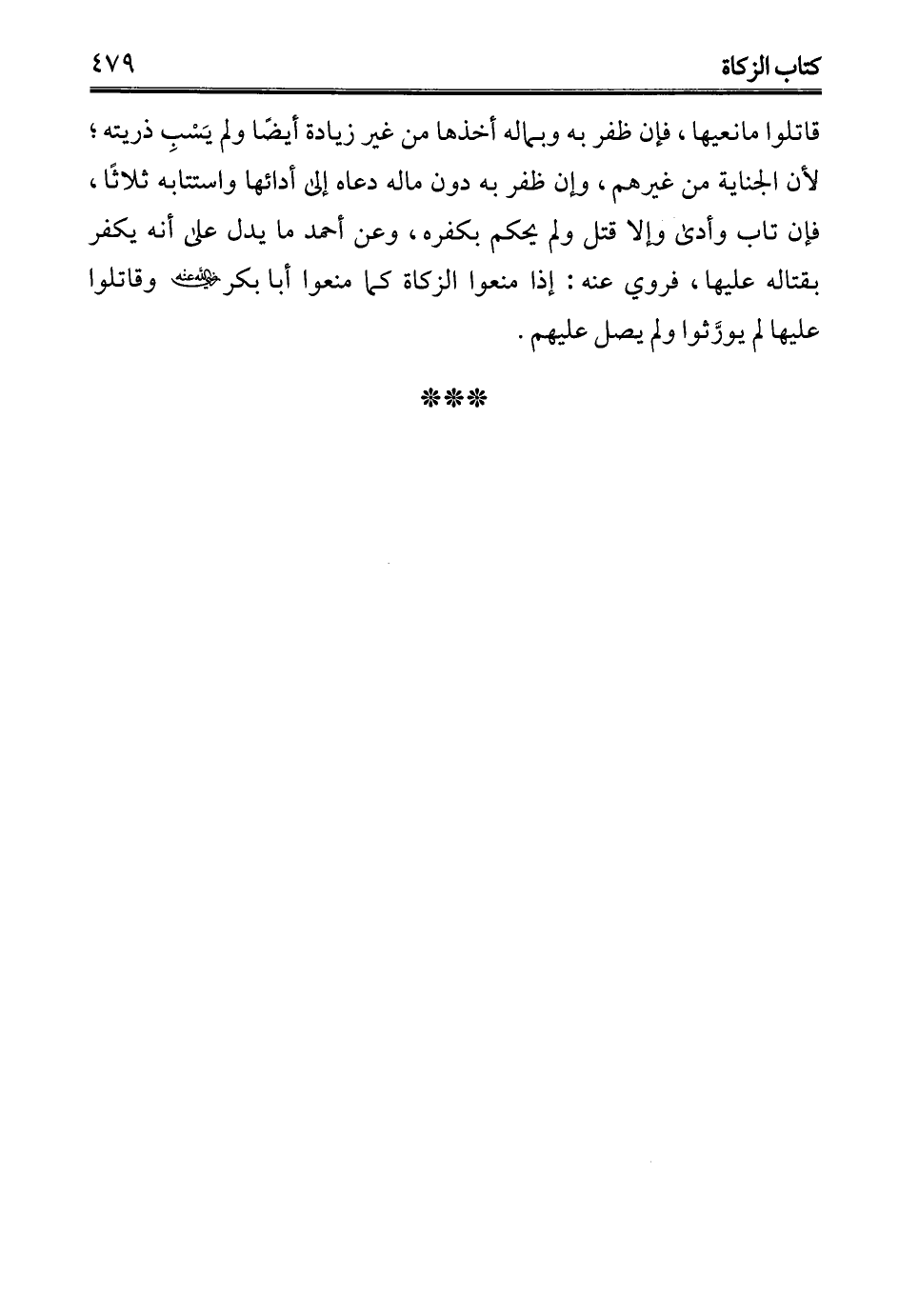 قاتلوا مانعيها، فإن ظفر به وبماله أخذها من غير زيادة أيضًا ولم يَسْبِ ذريته؛ لأن الجناية من غيرهم، وإن ظفر به دون ماله دعاه إلى أدائها واستتابه ثلاثًا، فإن تاب وأدى وإلا قتل ولم يحكم بكفره، وعن أحمد ما يدل على أنه يكفر بقتاله عليها، فروي عنه: إذا منعوا الزكاة كما منعوا أبا بكر - رضي الله عنه - وقاتلوا عليها لم يورَّثوا ولم يصل عليهم.