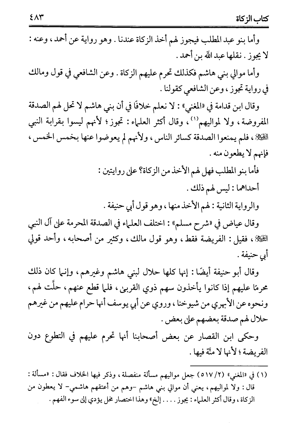 (¬1) في "المغني" (2/ 517) جعل مواليهم مسألة منفصلة، وذكر فيها الخلاف فقال: "مسألة: قال: ولا لمواليهم، يعني أن موالي بني هاشم -وهم من أعتقهم هاشمي- لا يعطون من الزكاة، وقال أكثر العلماء: يجوز .... إلخ" وهذا اختصار مخل يؤدي إلى سوء الفهم.