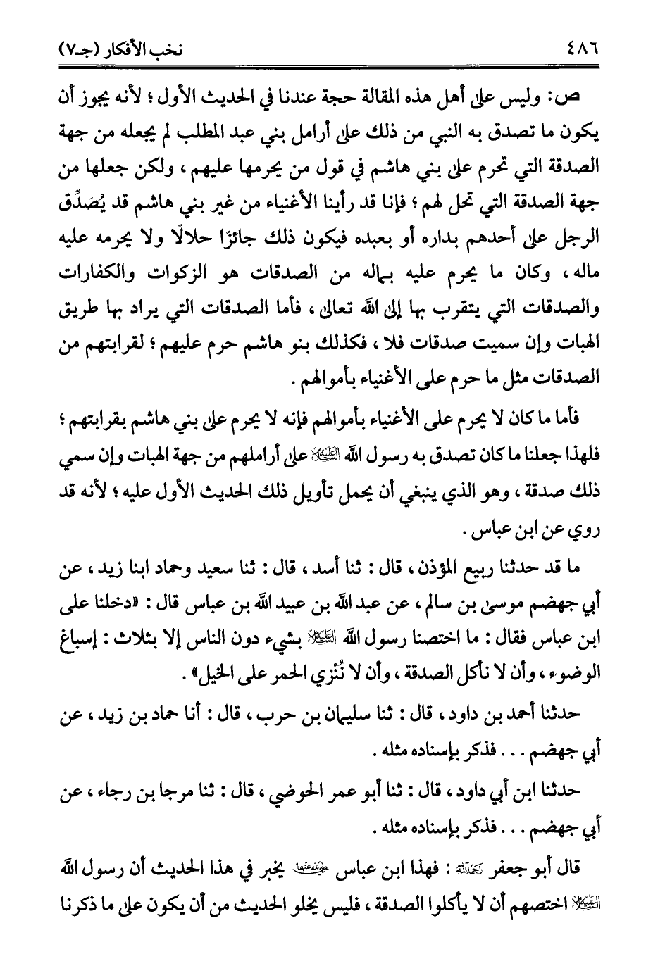 قال أبو جعفر -رحمه الله-: فهذا ابن عباس - رضي الله عنهما - يخبر في هذا الحديث أن رسول الله - عليه السلام - اختصهم أن لا يأكلوا الصدقة، فليس يخلو الحديث من أن يكون على ما ذكرنا