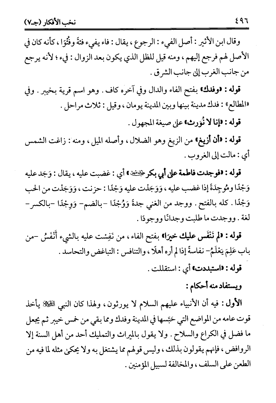 الأول: فيه أن الأنبياء عليهم السلام لا يورثون، ولهذا كان النبي - عليه السلام - يأخذ قوت عامه من المواضع التي حَبَّسها في المدينة وفدك ومما بقي من خمس خيبر ثم يجعل ما فضل في الكراع والسلاح. ولا يقول بالميراث والتمليك أحد من أهل السنة إلا الروافض، فإنهم يقولون بذلك، وليس قولهم مما يشتغل به ولا يحكى مثله لما فيه من الطعن علي السلف، والمخالفة لسبيل المؤمنين.