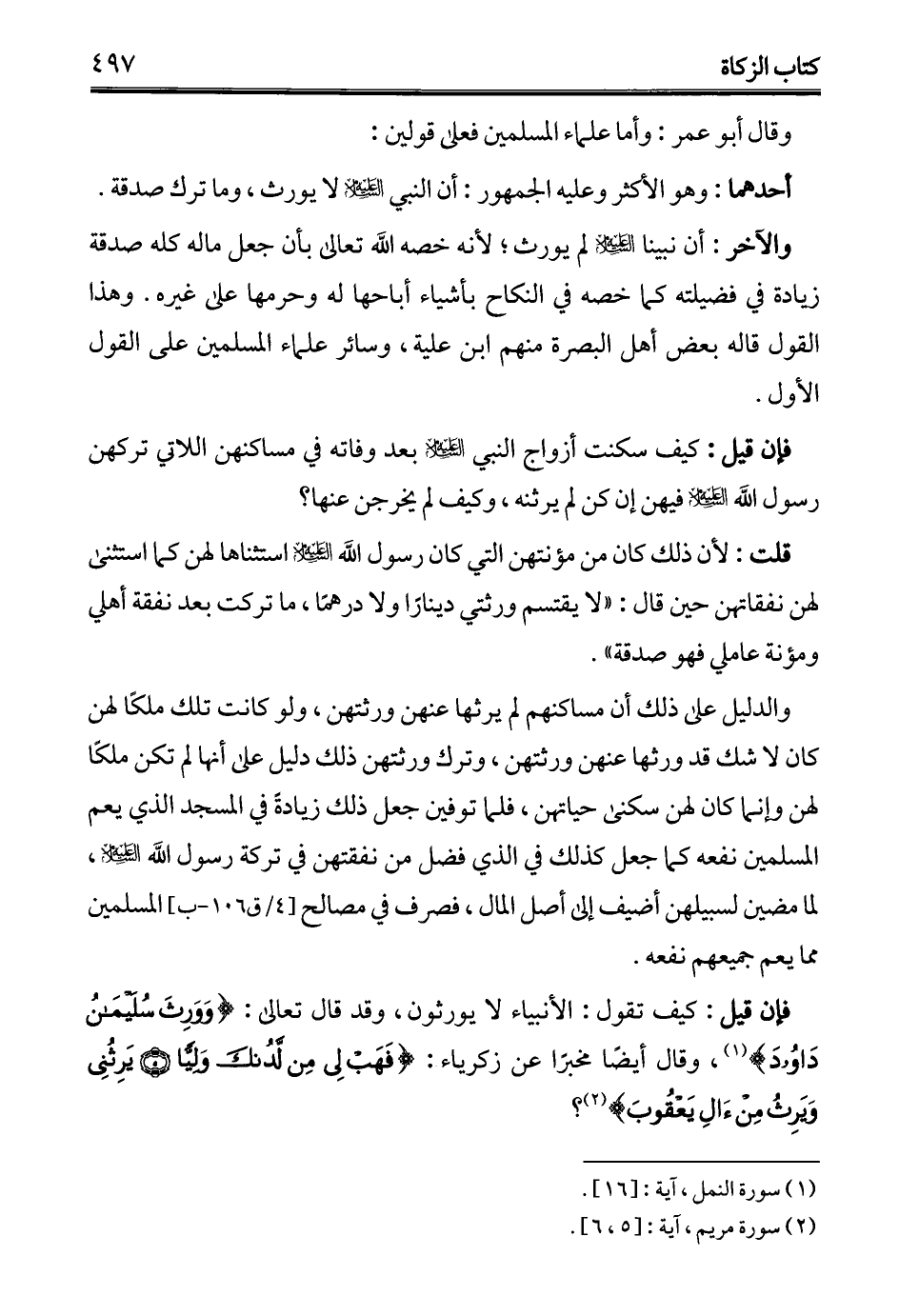 والدليل على ذلك أن مساكنهم لم يرثها عنهن ورثتهن، ولو كانت تلك ملكًا لهن كان لا شك قد ورثها عنهن ورثتهن، وترك ورثتهن ذلك دليل على أنها لم تكن ملكًا لهن وإنما كان لهن سكنى حياتهن، فلما توفين جعل ذلك زيادة في المسجد الذي يعم المسلمين نفعه كما جعل كذلك في الذي فضل من نفقتهن في تركة رسول الله - عليه السلام -، لما مضين لسبيلهن أضيف إلى أصل المال، فصرف في مصالح المسلمين مما يعم جميعهم نفعه.