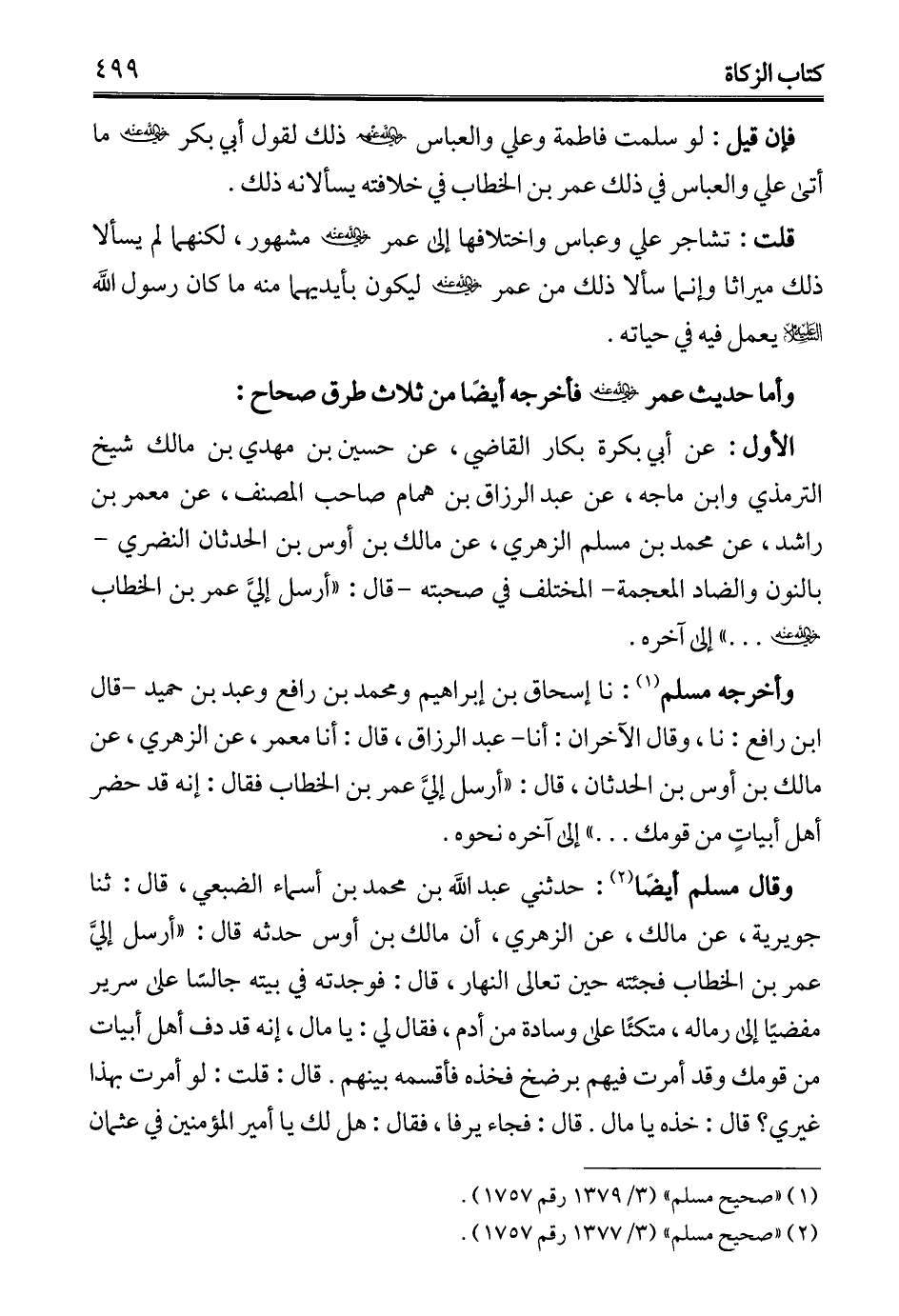 الأول: عن أبي بكرة بكار القاضي، عن حسين بن مهدي بن مالك شيخ الترمذي وابن ماجه، عن عبد الرزاق بن همام صاحب المصنف، عن معمر بن راشد، عن محمَّد بن مسلم الزهري، عن مالك بن أوس بن الحدثان النضري -بالنون والضاد المعجمة- المختلف في صحبته- قال: "أرسل إليَّ عمر بن الخطاب - رضي الله عنه - ... " إلى آخره.