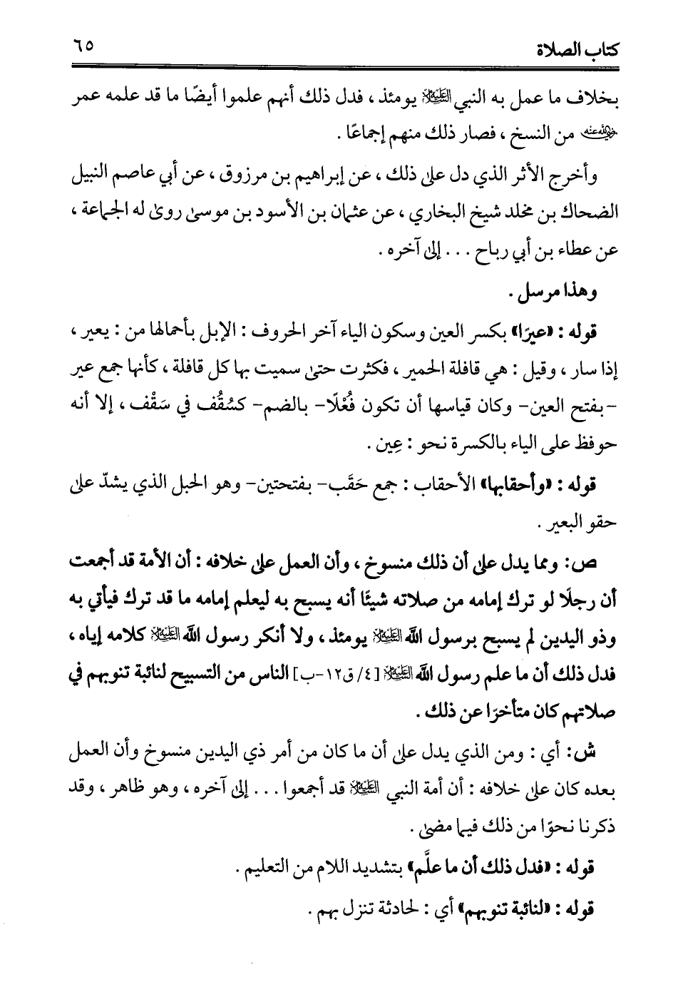 ص: ومما يدل على أن ذلك منسوخ، وأن العمل على خلافه: أن الأمة قد أجمعت أن رجلًا لو ترك إمامه من صلاته شيئًا أنه يسبح به ليعلم إمامه ما قد ترك فيأتي به وذو اليدين لم يسبح برسول الله - عليه السلام - يومئذ، ولا أنكر رسول الله - عليه السلام - كلامه إياه، فدل ذلك أن ما علم رسول الله - عليه السلام - الناس من التسبيح لنائبة تنوبهم في صلاتههم كان متأخرًا عن ذلك.