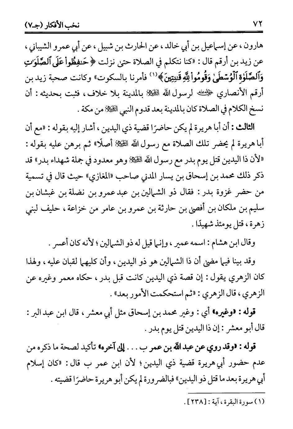 هارون، عن إسماعيل بن أبي خالد، عن الحارث بن شبيل، عن أبي عمرو الشيباني، عن زيد بن أرقم قال: "كنا نتكلم في الصلاة حتى نزلت {حَافِظُوا عَلَى الصَّلَوَاتِ وَالصَّلَاةِ الْوُسْطَى وَقُومُوا لِلَّهِ قَانِتِينَ} (¬1) فأمرنا بالسكوت" وكانت صحبة زيد بن أرقم الأنصاري - رضي الله عنه - لرسول الله - عليه السلام - بالمدينة بلا خلاف، فثبت بحديثه: أن نسخ الكلام في الصلاة كان بالمدينة بعد قدوم النبي - عليه السلام - من مكة.