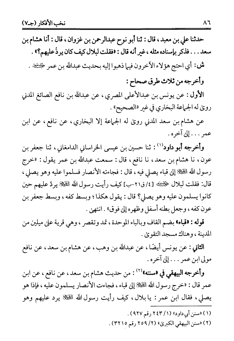 وأخرجه أبو داود (¬1): ثنا حسين بن عيسى الخراساني الدامغاني، ثنا جعفر بن عون، نا هشام بن سعد، نا نافع، قال: سمعت عبد الله بن عمر يقول: "خرج رسول الله - عليه السلام - إلى قباء يصلي فيه، قال: فجاءته الأنصار فسلموا عليه وهو يصلي، قال: فقلت لبلال - رضي الله عنه - كيف رأيت رسول الله - عليه السلام - يردّ عليهم حين كانوا يسلمون عليه وهو يصلي؟ قال: يقول هكذا؛ وبسط كفه، وبسط جعفر بن عون كفه، وجعل بطنه أسفل وظهره إلى فوق". انتهى.