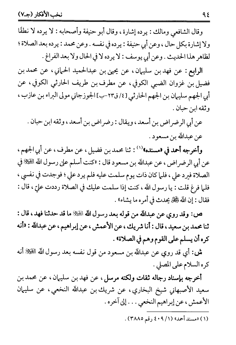 وأخرجه أحمد في "مسنده" (¬1): ثنا محمد بن فضيل، عن مطرف، عن أبي الجهم، عن أبي الرضراض، عن عبد الله بن مسعود قال: "كنت أسلم على رسول الله - عليه السلام - في الصلاة فيرد علي، فلما كان ذات يوم سلمت عليه فلم يرد علي؛ فوجدت في نفسي، فلما فرغ قلت: يا رسول الله، كنت إذا سلمت عليك في الصلاة رددت عليّ، قال: فقال: إن الله -عز وجل- يحدث في أمره ما يشاء".