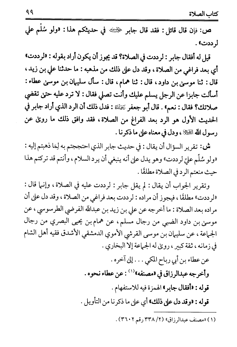 وتقرير الجواب أن يقال: لم يقل جابر: لرددت عليه في الصلاة، وإنما قال: "لرددت" مطلقًا، فيجوز أن مراده: لرددت بعد فراغي من الصلاة، وقد دل على أن مراده بعد الصلاة: ما أخرجه عن علي بن زيد بن عبد الله الفرضي الطرسوسي، عن موسى بن داود الضبي من رجال مسلم، عن همام بن يحيى البصري من رجال الجماعة، عن سليمان بن موسى القرشي الأموي الدمشقي الأشدق فقيه أهل الشام في زمانه، ثقة كبير، روى له الجماعة إلا البخاري.