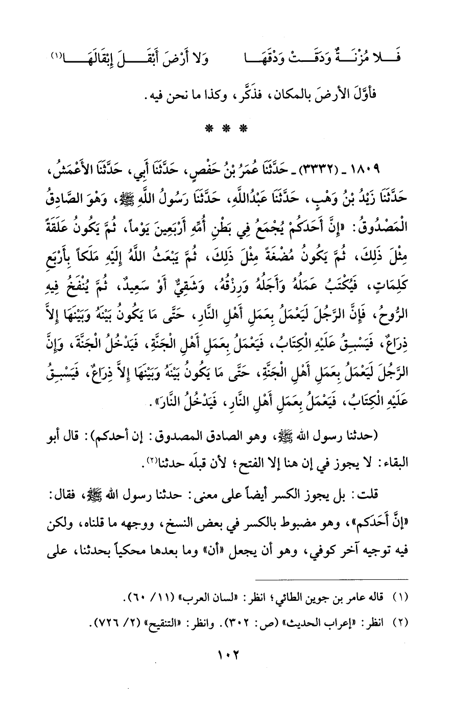 1809 - (3332) - حَدَّثَنَا عُمَرُ بْنُ حَفْصٍ، حَدَّثَنَا أَبِي، حَدَّثَنَا الأَعْمَشُ، حَدَّثَنَا زَيْدُ بْنُ وَهْبٍ، حَدَّثَنَا عَبْدُ اللهِ، حَدَّثَنَا رَسُولُ اللهِ - صلى الله عليه وسلم -، وَهوَ الصَّادِقُ الْمَصْدُوقُ: "إِنَّ أَحَدَكُمْ يُجْمَعُ فِي بَطْنِ أُمِّهِ أَرْبَعِينَ يَوْماً، ثُمَّ يَكُونُ عَلَقَةً مِثْلَ ذَلِكَ، ثُمَّ يَكُونُ مُضْغَةً مِثْلَ ذَلِكَ، ثُمَّ يَبْعَثُ اللهُ إِلَيْهِ مَلَكاً بِأَرْبَعِ كَلِمَاتٍ، فَيُكْتَبُ عَمَلُهُ وَأَجَلُهُ وَرِزْقُهُ، وَشَقِيٌّ أَوْ سَعِيدٌ، ثُمَّ يُنْفَخُ فِيهِ الرُّوحُ، فَإِنَّ الرَّجُلَ لَيَعْمَلُ بِعَمَلِ أَهْلِ النَّارِ، حَتَّى مَا يَكُونُ بَيْنَهُ وَبَيْنَهَا إِلاَّ ذِرَاعٌ، فَيَسْبِقُ عَلَيْهِ الْكِتَابُ، فَيَعْمَلُ بِعَمَلِ أَهْلِ الْجَنَّةِ، فَيَدْخُلُ الْجَنَّةَ، وَإِنَّ الرَّجُلَ لَيَعْمَلُ بِعَمَلِ أَهْلِ الْجَنَّةِ، حَتَّى مَا يَكُونُ بَيْنَهُ وَبَيْنَهَا إِلاَّ ذِرَاعٌ، فَيَسْبِقُ عَلَيْهِ الْكِتَابُ، فَيَعْمَلُ بِعَمَلِ أَهْلِ النَّارِ، فَيَدْخُلُ النَّارَ".