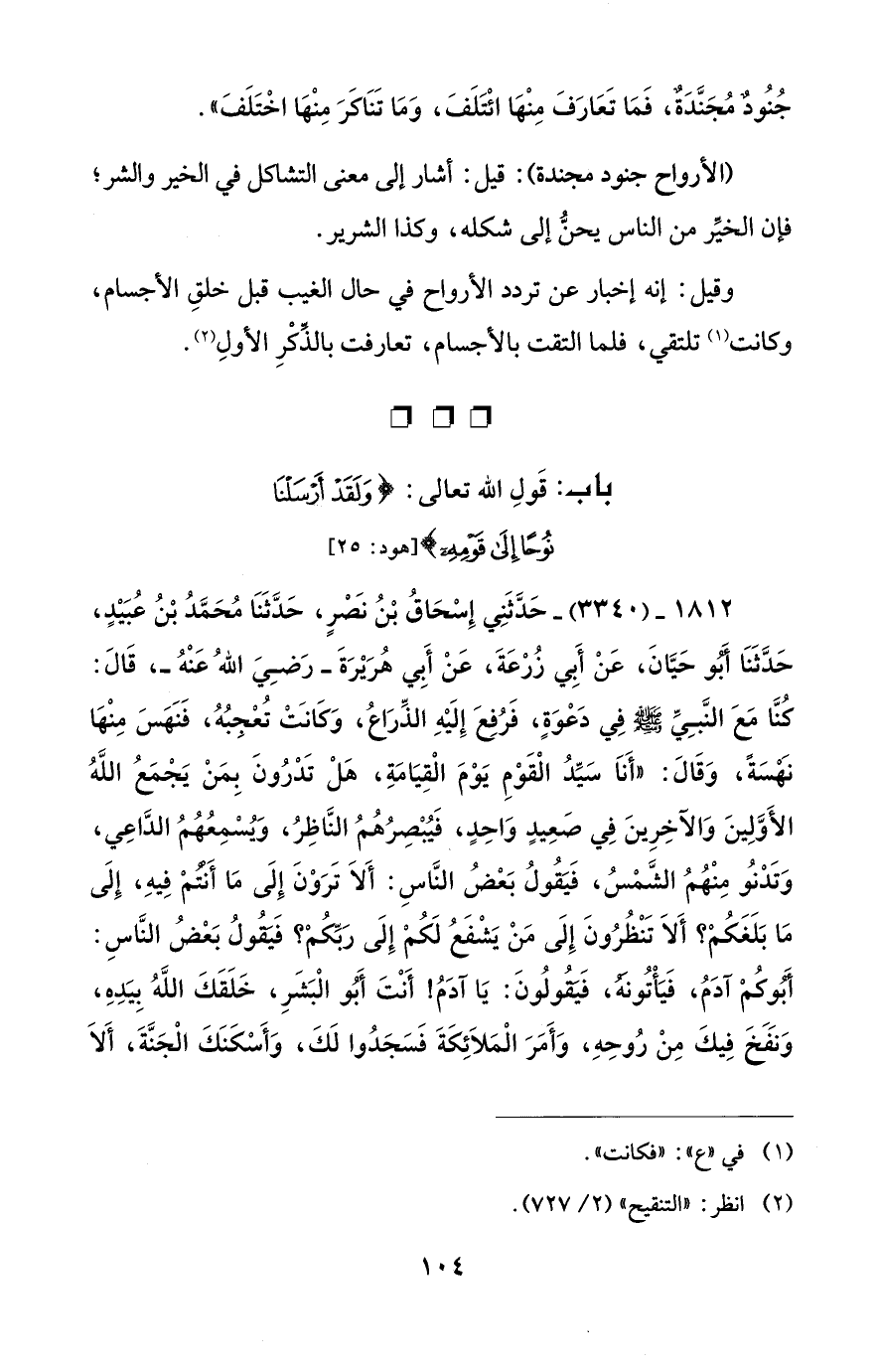 1812 - (3340) - حَدَّثَنِي إِسْحَاقُ بْنُ نَصْرٍ، حَدَّثَنَا مُحَمَّدُ بْنُ عُبَيْدٍ، حَدَّثَنَا أَبُو حَيَّانَ، عَنْ أَبِي زُرْعَةَ، عَنْ أَبِي هُرَيْرَةَ -رَضِيَ اللهُ عَنْهُ-، قَالَ: كُنَّا مَعَ النَّبِيِّ - صلى الله عليه وسلم - فِي دَعْوَةٍ، فَرُفِعَ إِلَيْهِ الذِّرَاعُ، وَكَانَتْ تُعْجِبُهُ، فَنَهَسَ مِنْهَا نَهْسَةً، وَقَالَ: "أَناَ سَيِّدُ الْقَوْمِ يَوْمَ الْقِيَامَةِ، هَلْ تَدْرُونَ بِمَنْ يَجْمَعُ اللهُ الأَوَّلِينَ وَالآخِرِينَ فِي صَعِيدٍ وَاحِدٍ، فَيُبْصِرُهُمُ النَّاظِرُ، وَيُسْمِعُهُمُ الدَّاعِي، وَتَدْنُو مِنْهُمُ الشَّمْسُ، فَيَقُولُ بَعْضُ النَّاسِ: أَلاَ تَرَوْنَ إِلَى مَا أَنْتُمْ فِيهِ، إِلَى مَا بَلَغَكُمْ؟ أَلاَ تَنْظُرُونَ إِلَى مَنْ يَشْفَعُ لَكُمْ إِلَى رَبِّكُمْ؟ فَيَقُولُ بَعْضُ النَّاسِ: أَبُوكُمْ آدَمُ، فَيَأْتُونَهُ، فَيَقُولُونَ: يَا آدَمُ! أَنْتَ أَبُو الْبَشَر، خَلَقَكَ اللهُ بِيَدهِ، وَنفَخَ فِيكَ مِنْ رُوحِهِ، وَأَمَرَ الْمَلاَئِكَةَ فَسَجَدُوا لَكَ، وَأَسْكَنَكَ الْجَنَّةَ، أَلاَ