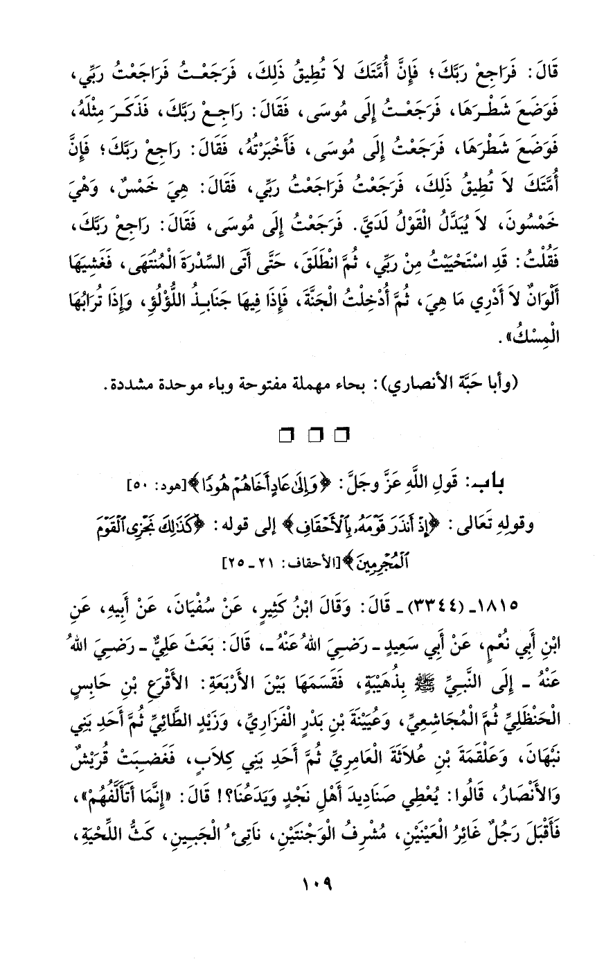 1815 - (3344) - قَالَ: وَقَالَ ابْنُ كَثِيرٍ، عَنْ سُفْيَانَ، عَنْ أَبِيهِ، عَنِ ابْنِ أَبِّي نُعْمٍ، عَنْ أَبِي سَعِيدٍ -رَضِيَ اللهُ عَنْهُ-، قَالَ: بَعَثَ عَلِيٌّ -رَضِيَ اللهُ عَنْهُ- إِلَى النَّبِيِّ - صلى الله عليه وسلم - بِذُهَيْبَةٍ، فَقَسَمَهَا بَيْنَ الأَرْبَعَةِ: الأَقْرَعِ بْنِ حَابِسٍ الْحَنْظَلِيِّ ثُمَّ الْمُجَاشِعِيِّ، وَعُيَيْنَةَ بْنِ بَدْرٍ الْفَزَارِيِّ، وَزَيْدٍ الطَّائِيِّ ثُمَّ أَحَدِ بَنِي نَبْهَانَ، وَعَلْقَمَةَ بْنِ عُلاَثَةَ الْعَامِرِيِّ ثُمَّ أَحَدِ بَنِي كِلاَبٍ، فَغَضِبَتْ قُرَيْشٌ وَالأَنْصَارُ، قَالُوا: يُعْطِي صَنَادِيدَ أَهْلِ نَجْدٍ وَيَدَعُنَا؟! قَالَ: "إِنَّمَا أَتَأَلَّفُهُمْ"، فَأَقْبَلَ رَجُلٌ غَائِرُ الْعَيْنَيْنِ، مُشْرِفُ الْوَجْنتَيْنِ، ناَتِئُ الْجَبِينِ، كَثُّ اللِّحْيَةِ،